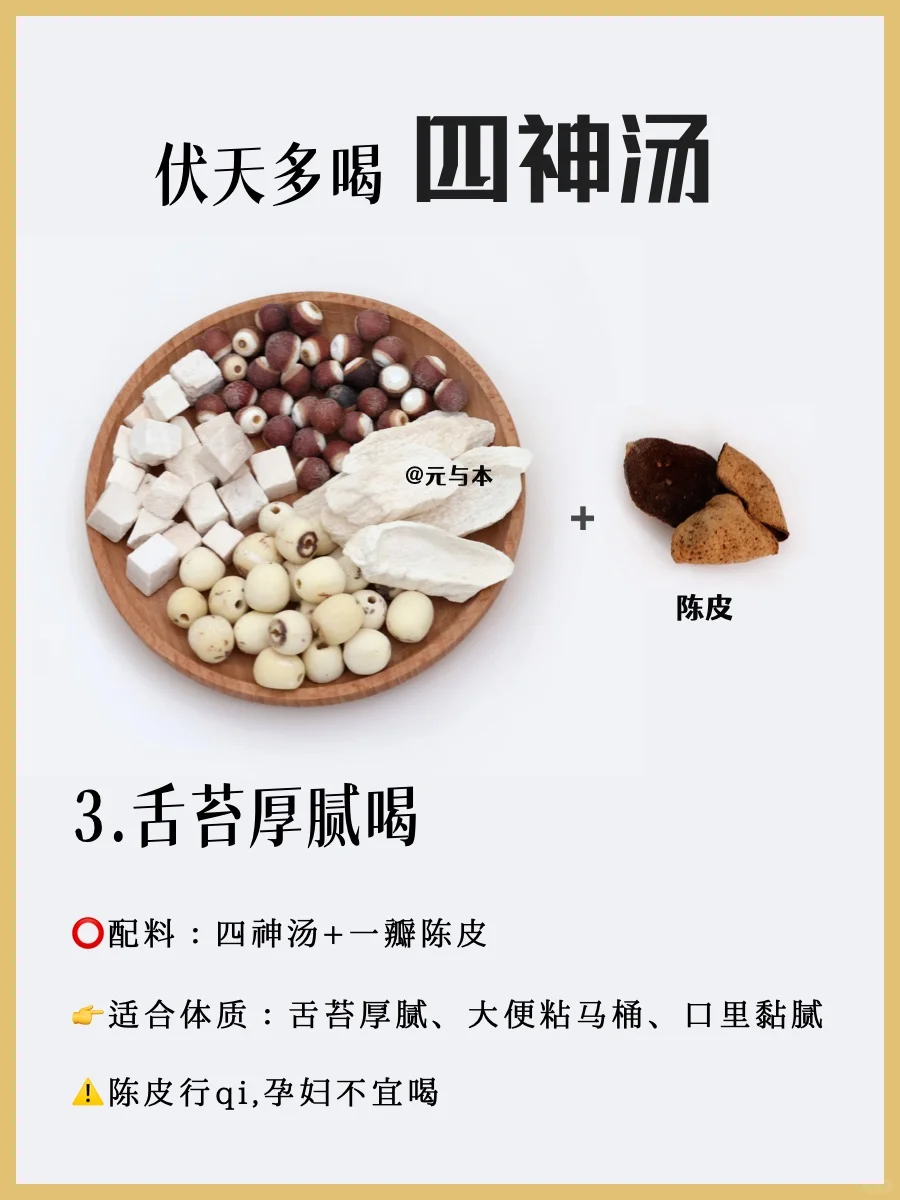 👉四神汤+陈皮,适合舌苔厚腻、脾胃运化不好,大便粘马桶的人喝。