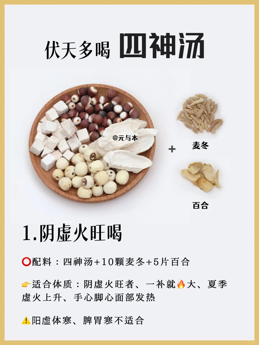👉四神汤+麦冬+百合,适合阴虚内热体质,容易上🔥、手心脚心面部发热的人。