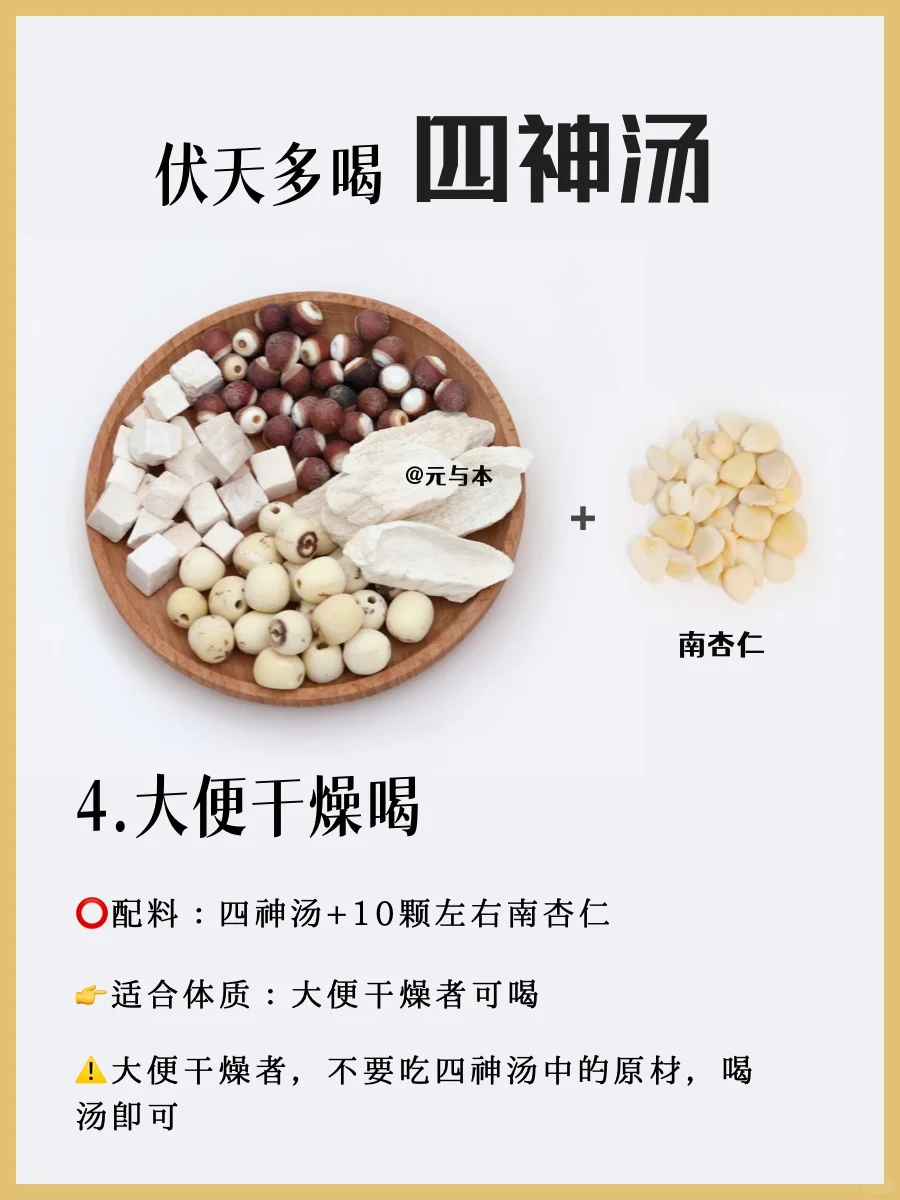 👉四神汤+南杏仁,适合大便干燥的人。