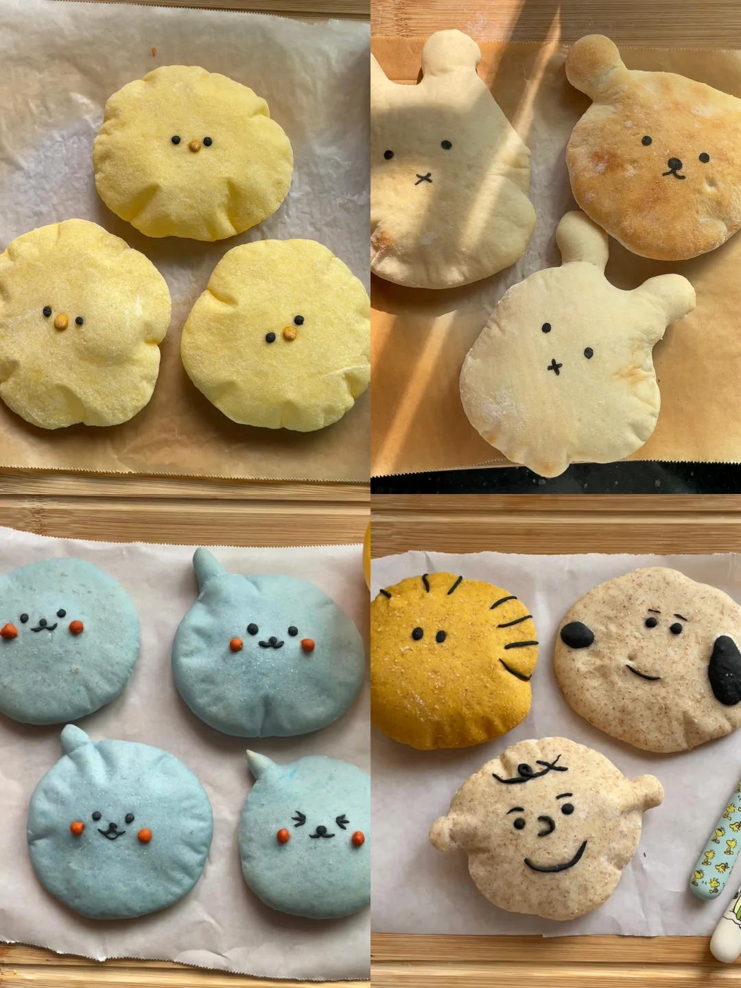 哎呀,皮塔饼都变成萌宠了,这年头连面包也要拼颜值吗?不过看这造型,真的想每个都尝尝,就当是和卡通人物共进餐啦!