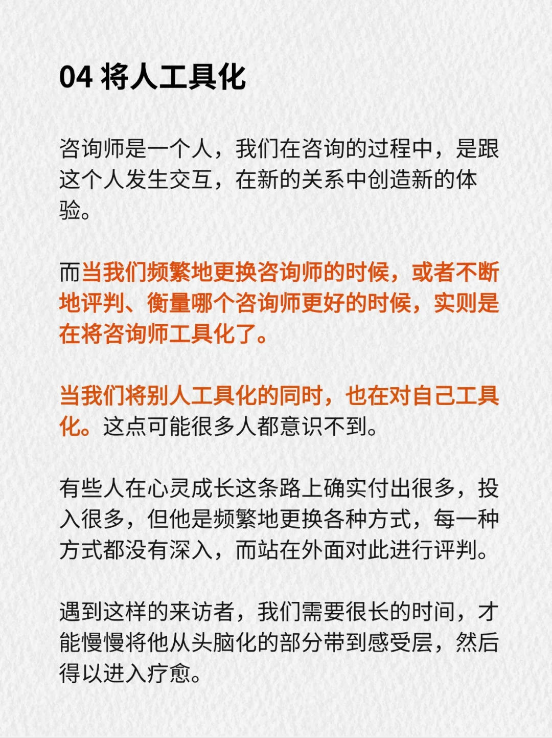 而当我们频繁地更换咨询师的时候,或者不断地评判、衡量哪个咨询师更好的时候,实则是在将咨询师工具化了。