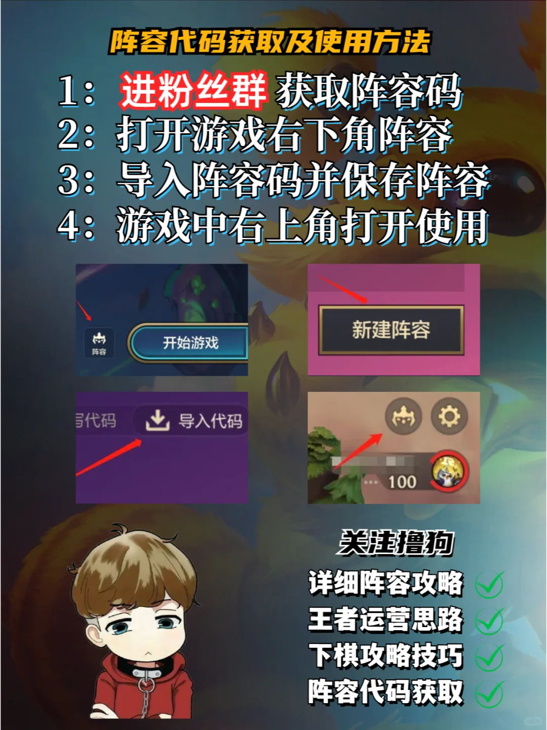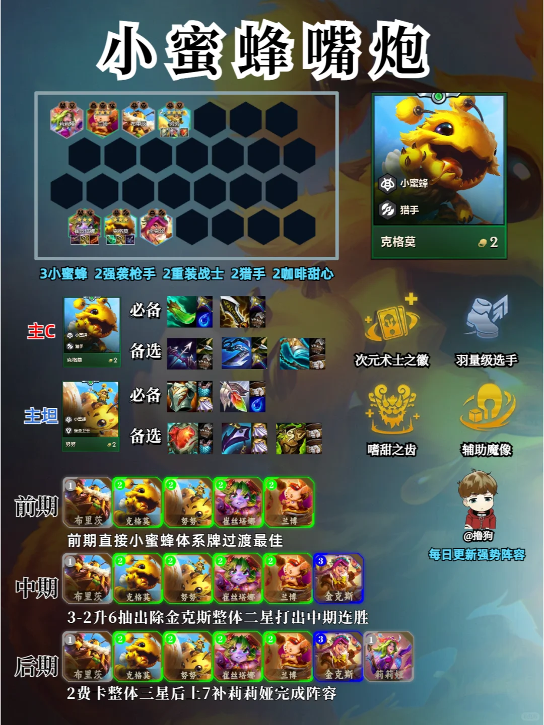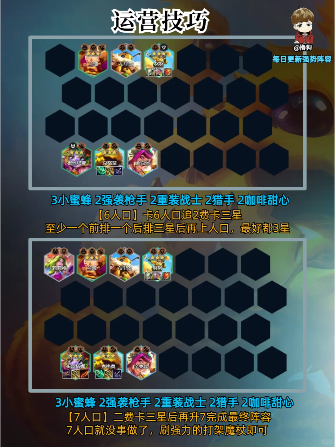 ❗阵容码进笔记下方粉丝群,有问题都可以问,都会回答 ①由于大嘴会被玩金克斯拿,如果小炮数量多可以让小炮做主C,另一个可以做红buff帮忙打重伤 ②前期小蜜蜂多的话可以直接连胜强度很高,如果数量少最好要观察外面有没有同行再考虑玩 ③努努如果数量实在少可以让兰博做主坦,另一个做日炎救赎功能装,和大嘴小炮同理