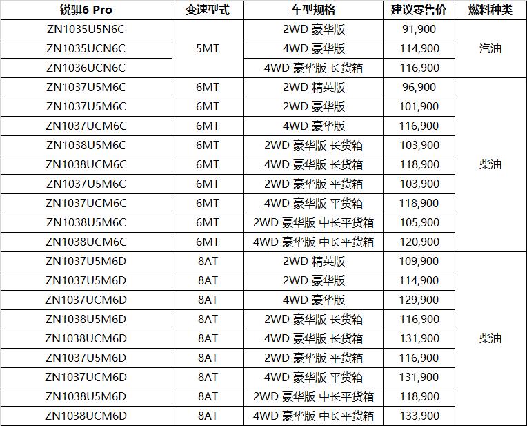 【9.19万元起 郑州日产锐骐6 Pro开启预售 】郑州日产锐骐6 Pro正式开启预售,价格区间为9.19万元-13.39万元,共推出21种车型。该车相较现款锐骐6针对外观以及动力方面进行了升级,产品力得到进一步提升。 外观方面,新车在前脸部分进行了比较明显的升级,大嘴式格栅内部采用网状装饰,两侧还配备有类似进气口的装饰,同时大灯内部接口以及下包围的造型也有细节上的调整,整体的精致感得到大幅提升。 新车侧面和尾部变化不大,同样也是细节方面的升级,例如配备了熏黑的车顶行李架和门把手,后保险杠则是采用车身同色设计,增添了一些都市感。 此外,官方同时还表示新车在动力和装载能力方面将会得到加强,从官图来看尾箱或得到加长,不过具体尺寸还有待官方公布。 动力方面参考现款锐骐6,其搭载2.4升汽油发动机和2.3T柴油发动机,最大功率分别为116千瓦和120千瓦,传动系统分别匹配5速、6速手动变速箱以及8速自动变速箱。【来自懂车帝车友圈】