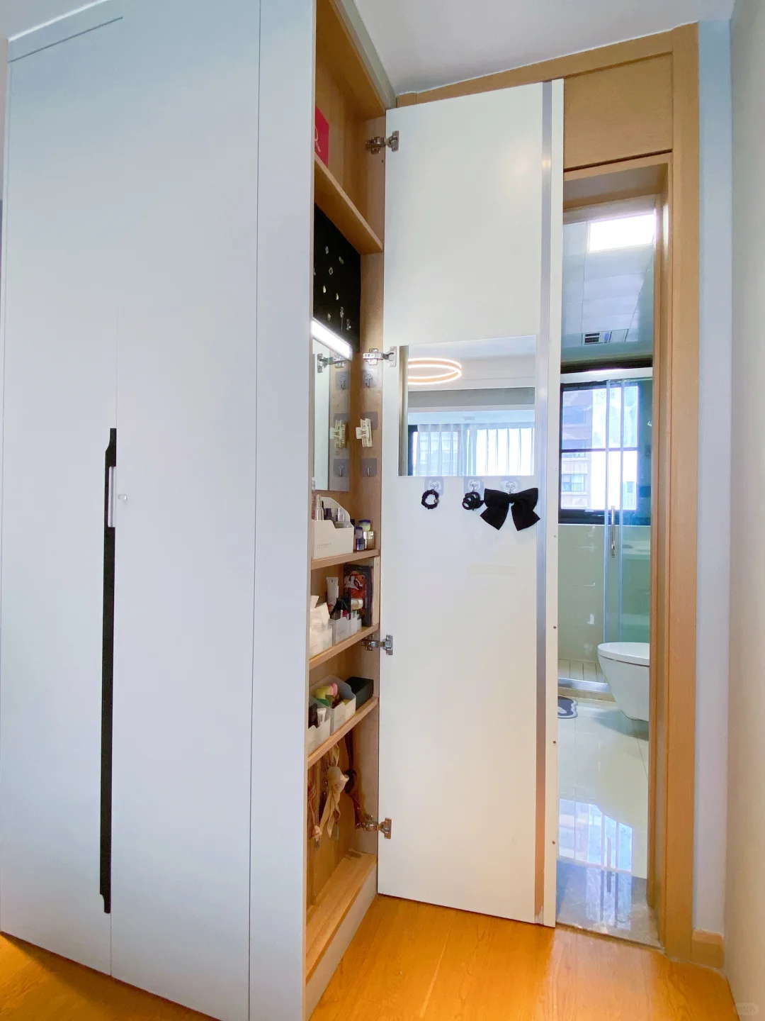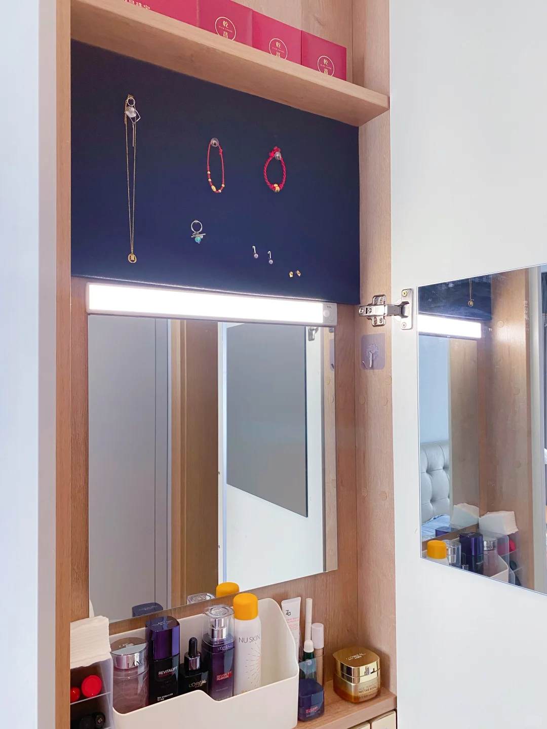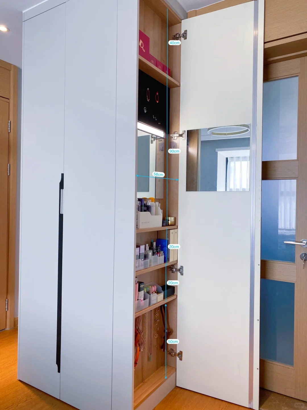 大家一直要的梳妆台/超薄梳妆柜 详细尺寸图来了,柜子净深9cm, 包含柜门共12cm厚,真的特别实用❗ 我的身高1.6米,大家可以做个参考 内部分格尺寸可以根据自己身高调整[飞吻R] 这个柜子特别好的地方就是真的免打扫! 特别不容易落灰,3年没打扫过,哈哈。 还有大家说不能坐着化妆的问题, 其实搭配个高脚凳可以坐着化妆哦💕