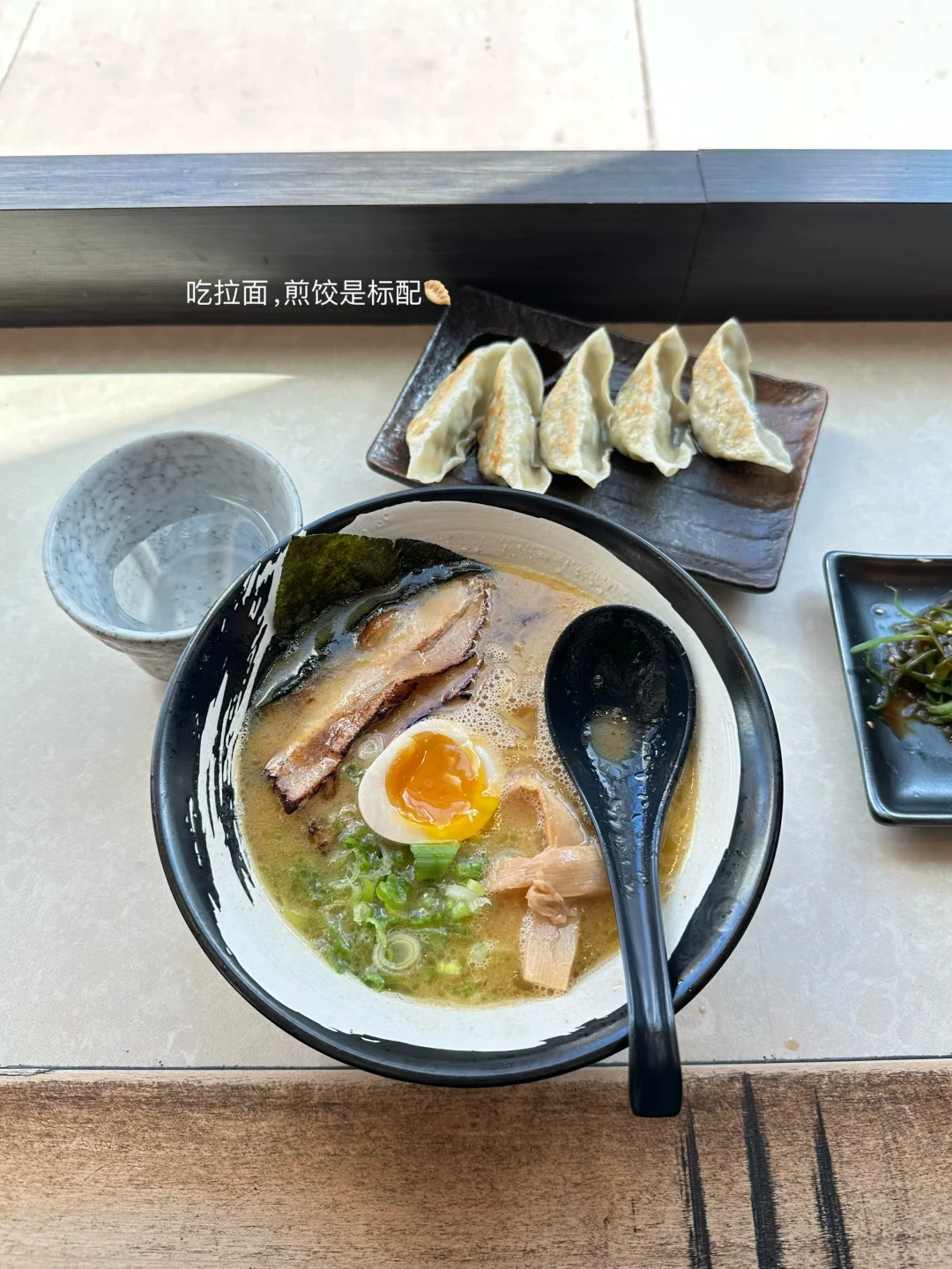浓浓的猪油汤底很醇厚配一盘儿煎饺