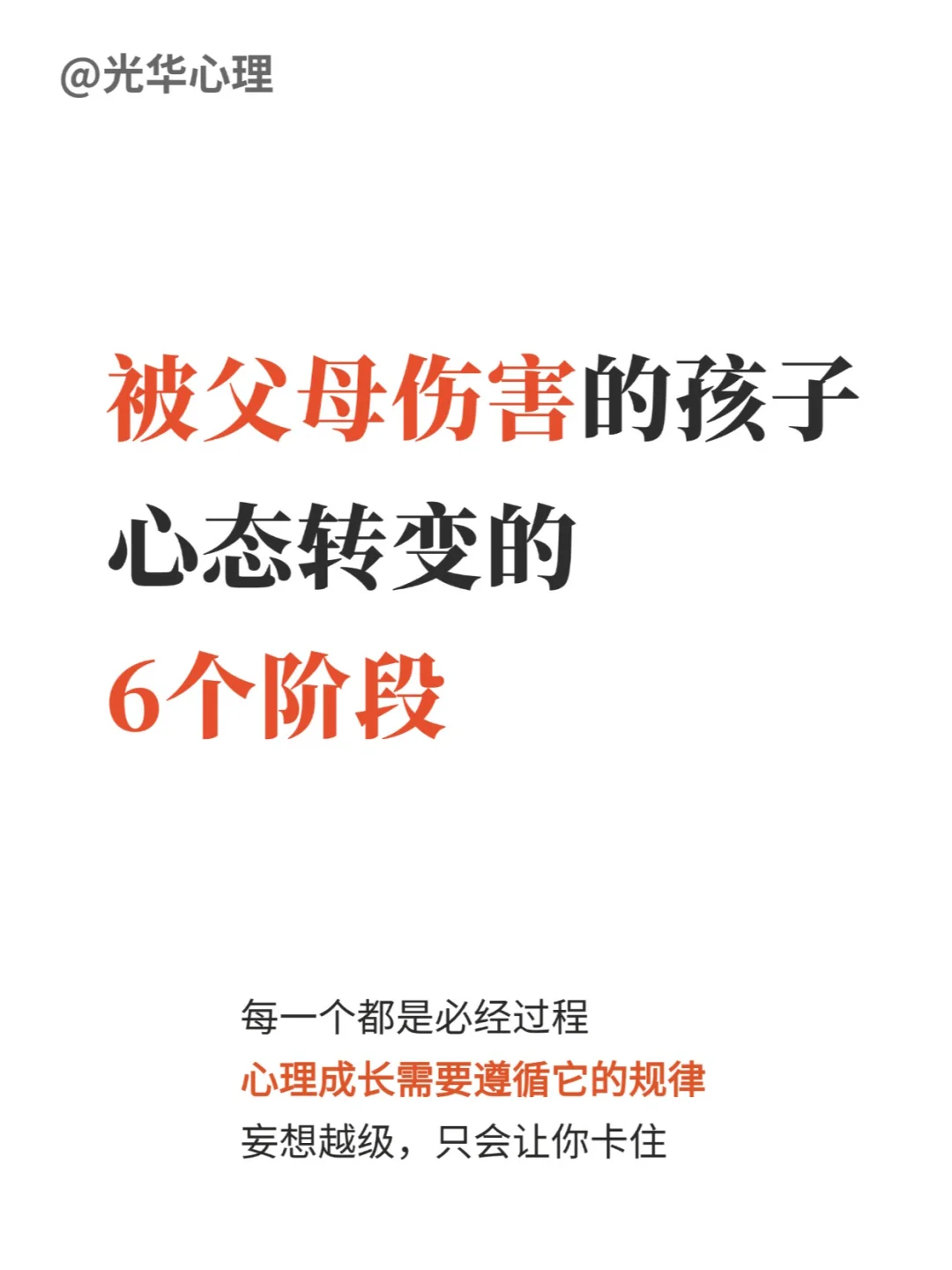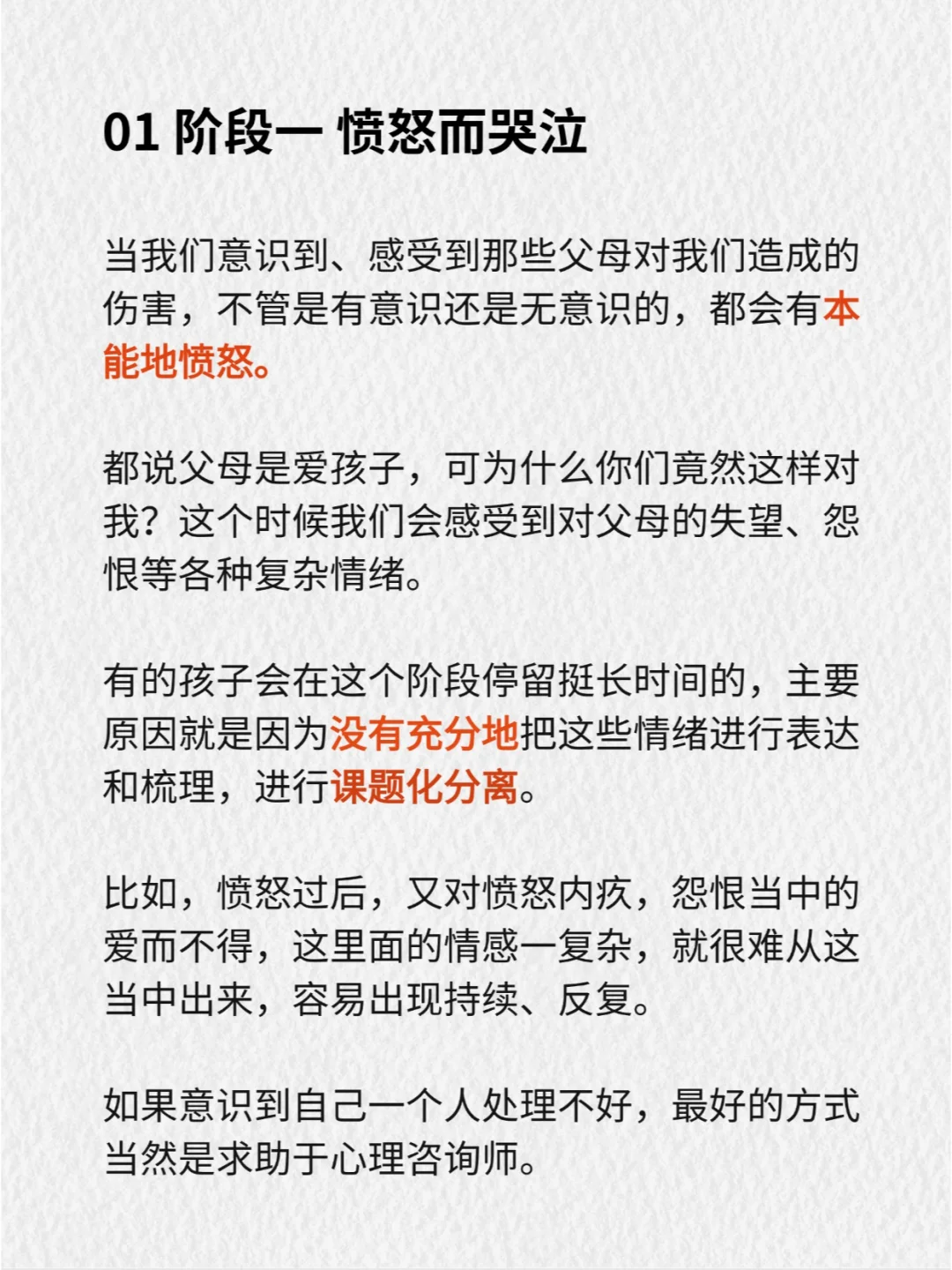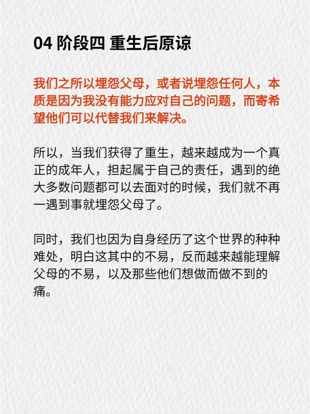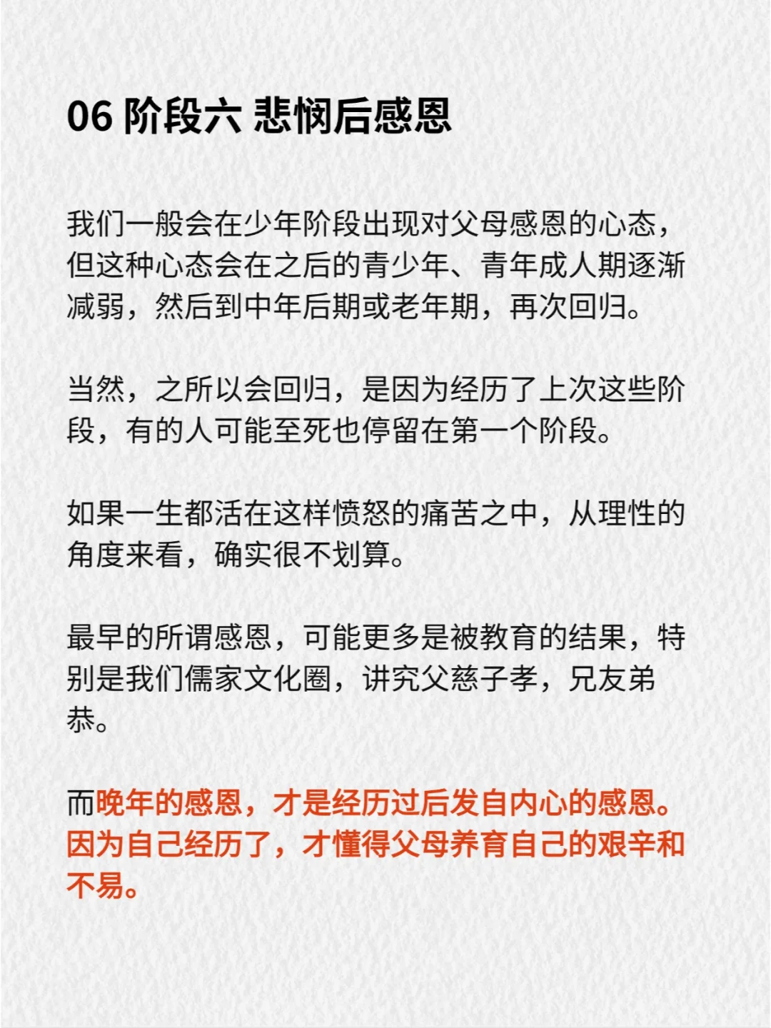 阶段[一R]愤怒而哭泣 当我们意识到、感受到那些父母对我们造成的伤害,不管是有意识还是无意识的,都会有本能地愤怒。 都说父母是爱孩子,可为什么你们竟然这样对我?这个时候我们会感受到对父母的失望、怨恨等各种复杂情绪。 有的孩子会在这个阶段停留挺长时间的,主要原因就是因为没有充分地把这些情绪进行表达和梳理,进行课题化分离。 阶段[二R]哭泣后哀悼 在充分地表达对父母的愤怒的过程中,往往伴随着痛哭流涕。 越是真正地认识到,自己的人生并不圆满,父母的不完美,自己就是摊上了这样一个父亲或母亲,且自己无力改变,就会哭得越彻底。 同时,在哭泣的过程中,我们不仅在头脑层面,在情感层面也接受了自己当下的命运。 它是一种“我的人生如此悲惨,且过去无法修改”的无力感。 这时,我们就进入了哀悼,即接受,同时也放下过去,放下这些无法改变的事实。 阶段[三R]哀悼后重生 当我们从理智到情感都接受过去无法改变的事实,我们的能量就从这里获得解脱了,不再执着于此了,转而可以把能量投注到新的人生征程当中。所以我们说,获得了重生。 这时,我们向一个真正的成年人开始转变。 我们通过职业、兴趣爱好、学习等方式拓展自己的人际关系,构建属于自己社会支持系统,不再一遇到事就求助于父母,然后又埋怨他们满足不了你的需求,继而又陷入跟他们的纠缠之中。 阶段[四R]重生后原谅 我们之所以埋怨父母,或者说埋怨任何人,本质是因为我没有能力应对自己的问题,而寄希望他们可以代替我们来解决。 所以,当我们获得了重生,越来越成为一个真正的成年人,担起属于自己的责任,遇到的绝大多数问题都可以去面对的时候,我们就不再一遇到事就埋怨父母了。 阶段[五R]原谅后悲悯 悲悯来源于自己也经历了类似的苦痛,且懂得心疼自己。 这时候,我们就慢慢能够理解他们的脆弱、无能,甚至愚昧。 我们在理解和接受自己的局限性和缺憾的同时,也慢慢理解了父母他们的缺陷,他们很多的做不到,不是因为不愿,而是不能。 阶段[六R]悲悯后感恩 我们一般会在少年阶段出现对父母感恩的心态,但这种心态会在之后的青少年、青年成人期逐渐减弱,然后到中年后期或老年期,再次回归。 最早的所谓感恩,可能更多是被教育的结果,特别是我们儒家文化圈,讲究父慈子孝,兄友弟恭。 而晚年的感恩,才是经历过后发自内心的感恩。因为自己经历了,才懂得父母养育自己的艰辛和不易。