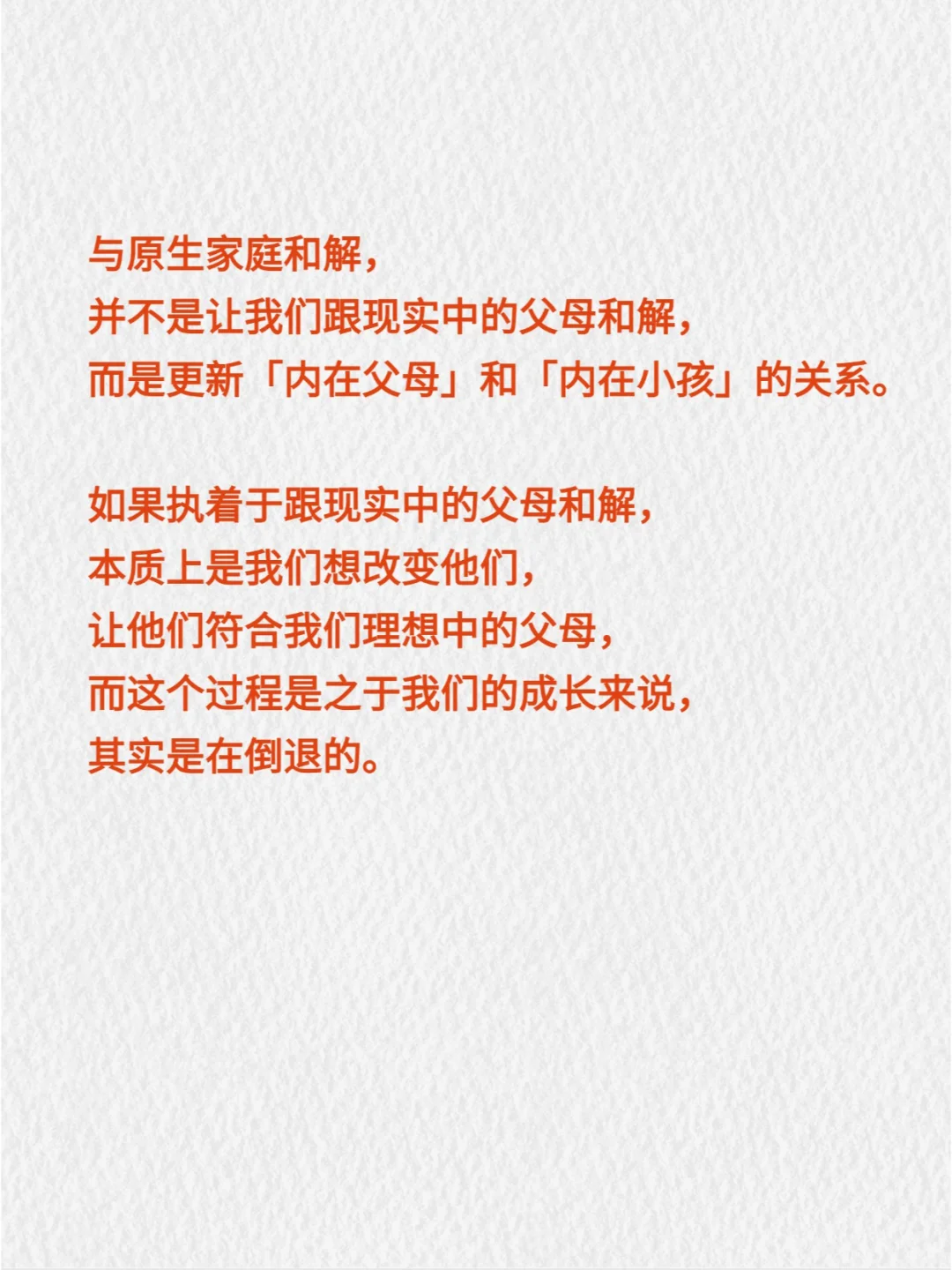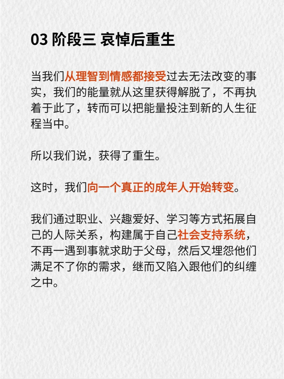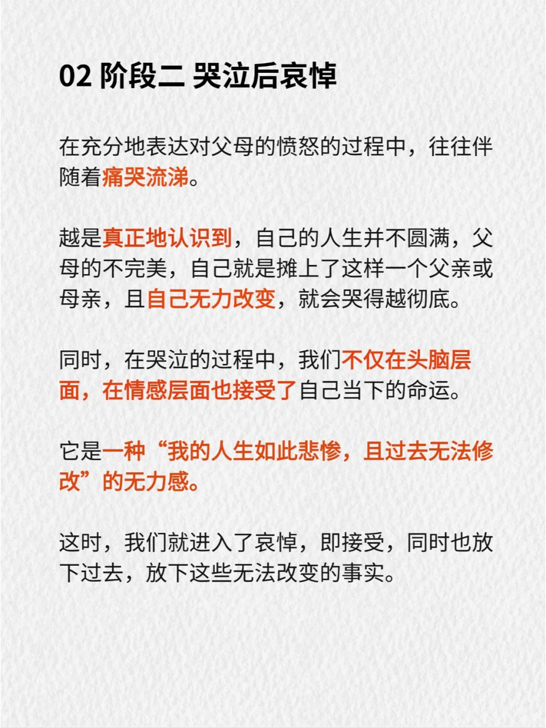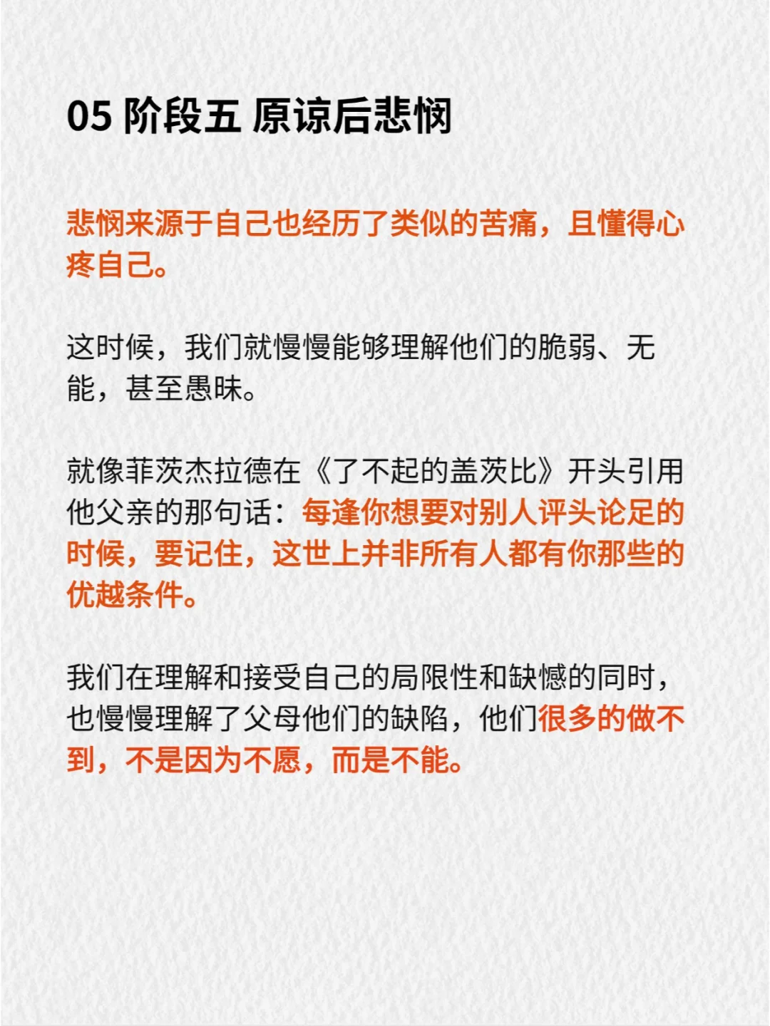 阶段[一R]愤怒而哭泣 当我们意识到、感受到那些父母对我们造成的伤害,不管是有意识还是无意识的,都会有本能地愤怒。 都说父母是爱孩子,可为什么你们竟然这样对我?这个时候我们会感受到对父母的失望、怨恨等各种复杂情绪。 有的孩子会在这个阶段停留挺长时间的,主要原因就是因为没有充分地把这些情绪进行表达和梳理,进行课题化分离。 阶段[二R]哭泣后哀悼 在充分地表达对父母的愤怒的过程中,往往伴随着痛哭流涕。 越是真正地认识到,自己的人生并不圆满,父母的不完美,自己就是摊上了这样一个父亲或母亲,且自己无力改变,就会哭得越彻底。 同时,在哭泣的过程中,我们不仅在头脑层面,在情感层面也接受了自己当下的命运。 它是一种“我的人生如此悲惨,且过去无法修改”的无力感。 这时,我们就进入了哀悼,即接受,同时也放下过去,放下这些无法改变的事实。 阶段[三R]哀悼后重生 当我们从理智到情感都接受过去无法改变的事实,我们的能量就从这里获得解脱了,不再执着于此了,转而可以把能量投注到新的人生征程当中。所以我们说,获得了重生。 这时,我们向一个真正的成年人开始转变。 我们通过职业、兴趣爱好、学习等方式拓展自己的人际关系,构建属于自己社会支持系统,不再一遇到事就求助于父母,然后又埋怨他们满足不了你的需求,继而又陷入跟他们的纠缠之中。 阶段[四R]重生后原谅 我们之所以埋怨父母,或者说埋怨任何人,本质是因为我没有能力应对自己的问题,而寄希望他们可以代替我们来解决。 所以,当我们获得了重生,越来越成为一个真正的成年人,担起属于自己的责任,遇到的绝大多数问题都可以去面对的时候,我们就不再一遇到事就埋怨父母了。 阶段[五R]原谅后悲悯 悲悯来源于自己也经历了类似的苦痛,且懂得心疼自己。 这时候,我们就慢慢能够理解他们的脆弱、无能,甚至愚昧。 我们在理解和接受自己的局限性和缺憾的同时,也慢慢理解了父母他们的缺陷,他们很多的做不到,不是因为不愿,而是不能。 阶段[六R]悲悯后感恩 我们一般会在少年阶段出现对父母感恩的心态,但这种心态会在之后的青少年、青年成人期逐渐减弱,然后到中年后期或老年期,再次回归。 最早的所谓感恩,可能更多是被教育的结果,特别是我们儒家文化圈,讲究父慈子孝,兄友弟恭。 而晚年的感恩,才是经历过后发自内心的感恩。因为自己经历了,才懂得父母养育自己的艰辛和不易。