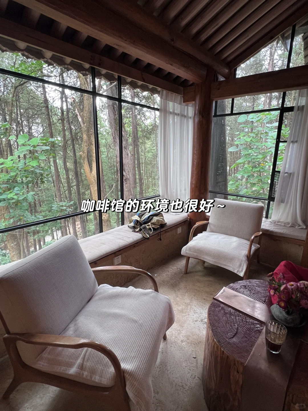 寺庙里还有间落地窗的咖啡馆,正对着树林非常惬意~店里的饮品价格味道都很适中,推荐大家吃完午饭可以在这儿小憩一下再下山[萌萌哒R]
