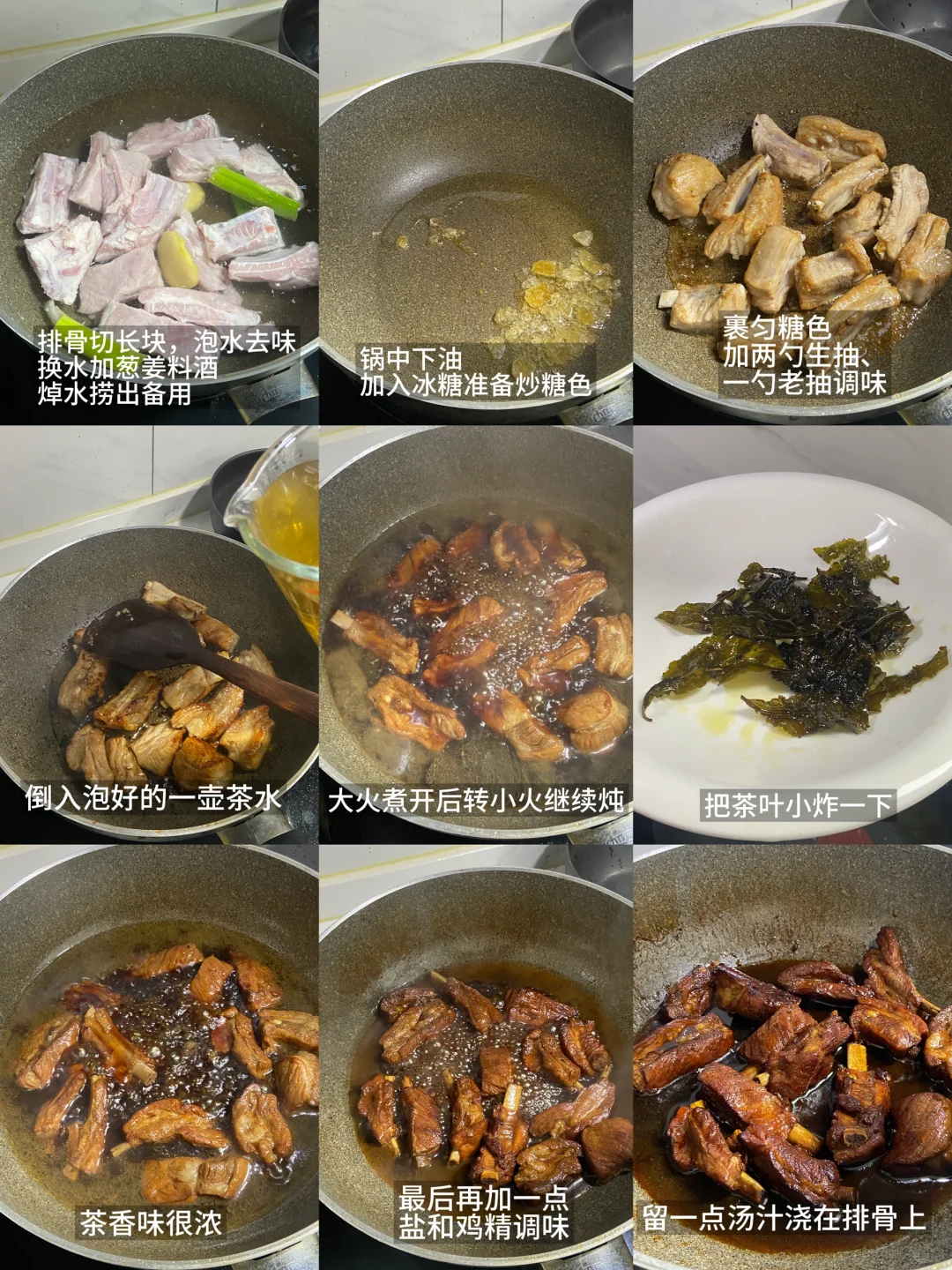 3)炒完糖色加两勺生抽、一勺老抽调味,再加入葱段,翻拌均匀后,倒入刚才的茶水,用茶煮排骨