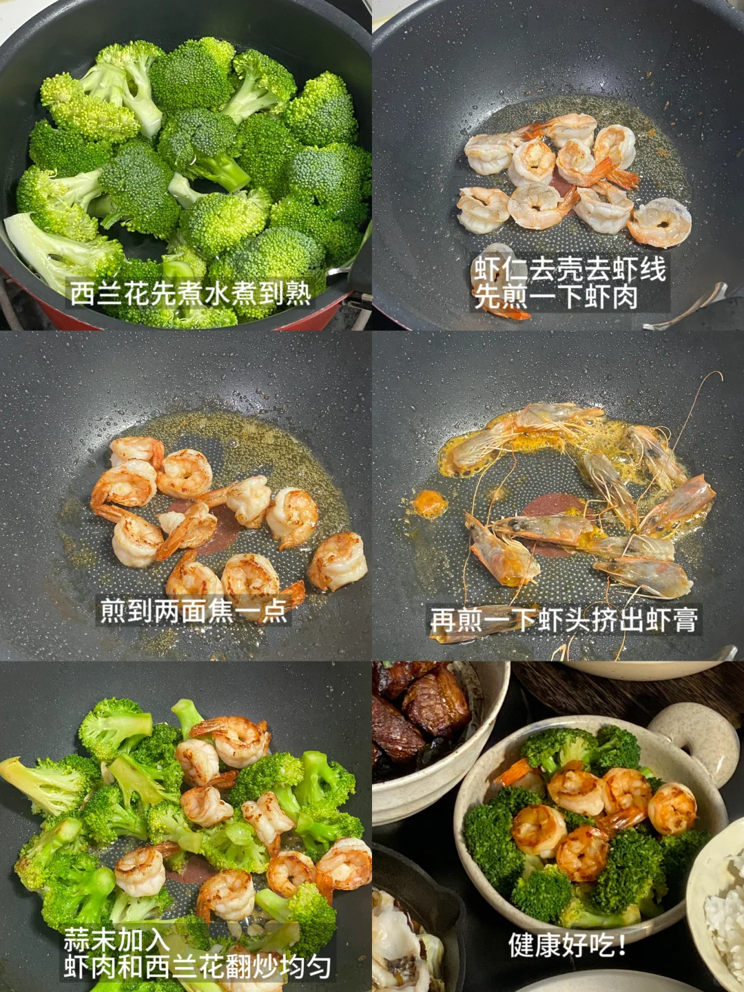 1)西兰花提前焯水捞出备用,虾仁去壳去虾线,先煎一下虾肉,再煎一下虾头挤出虾膏