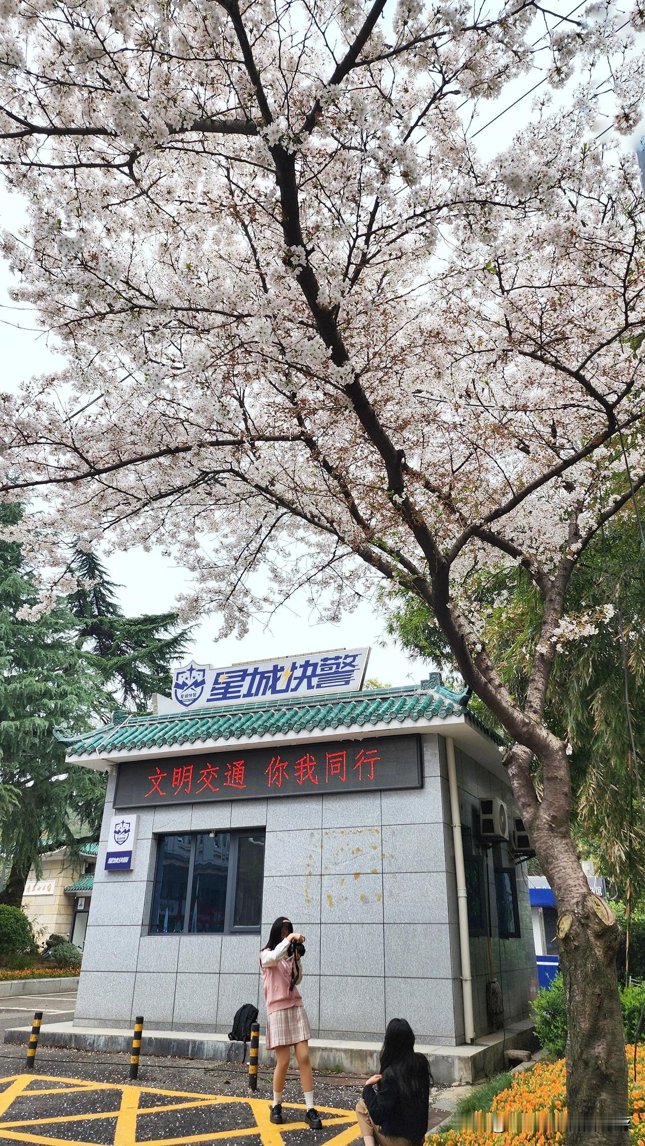 #春日生活打卡季# #长沙美景来一波# #长沙雪树银花# 星城快警岗亭美不美? 花开树下人相伴,春意盎然乐无边。 长沙烈士公园南大门,星城快警岗亭樱花树。 花开100%,赏花要趁早,一场风雨花满地