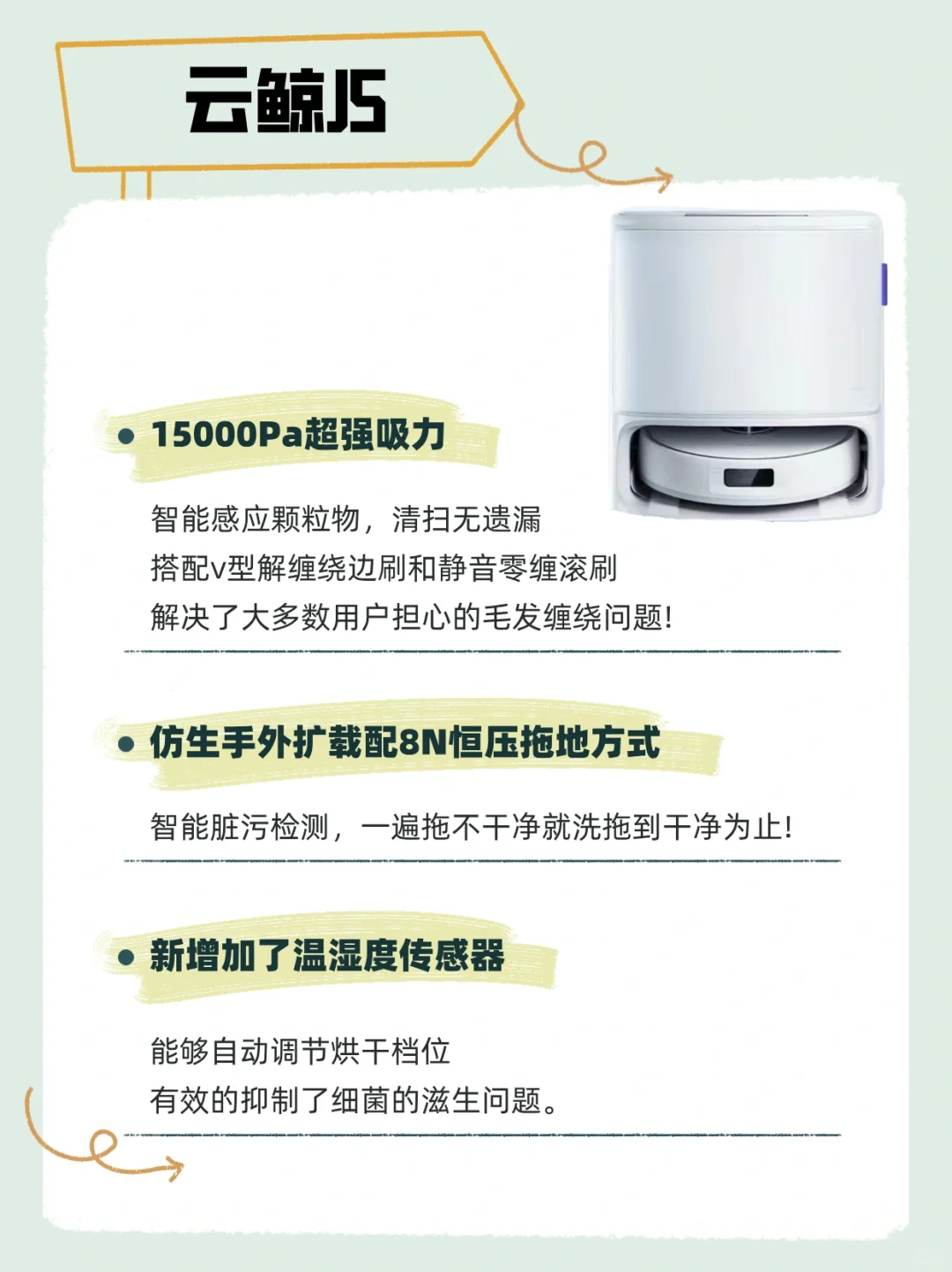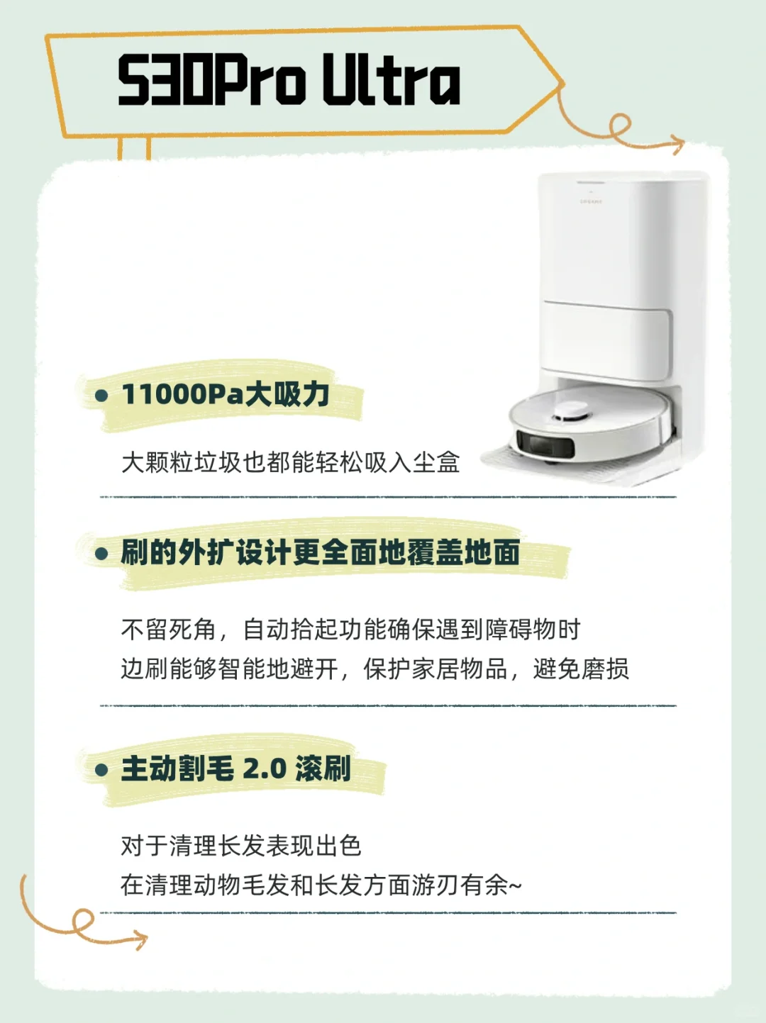 15000Pa的超强吸力,智能感应颗粒物,清扫无遗漏。搭配v型解缠绕边刷和静音零缠滚刷,解决了大多数用户担心的毛发缠绕问题!