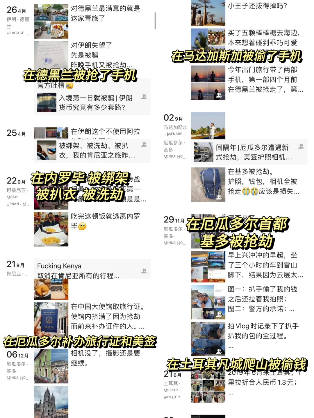 2️⃣在肯尼亚内罗毕因为轻信路人的邀请,去了他家做客,结果下一秒就被扒光抢劫了,还因为给了假密码被暴揍了一顿,还好最终拿钱换来了平安,更详细的内容在置顶笔记。