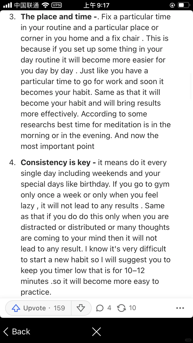 在你的日常生活中,在家里的某个地方或角落里,找一个固定的坐处。它会让你一天比一天更容易。就像你有一个在特定的时间去上班,很快它就会成为你的习惯。同样,它也会成为你的一种习惯,并会更有效地带来结果。研究表明,冥想的最佳时间是早上或晚上。