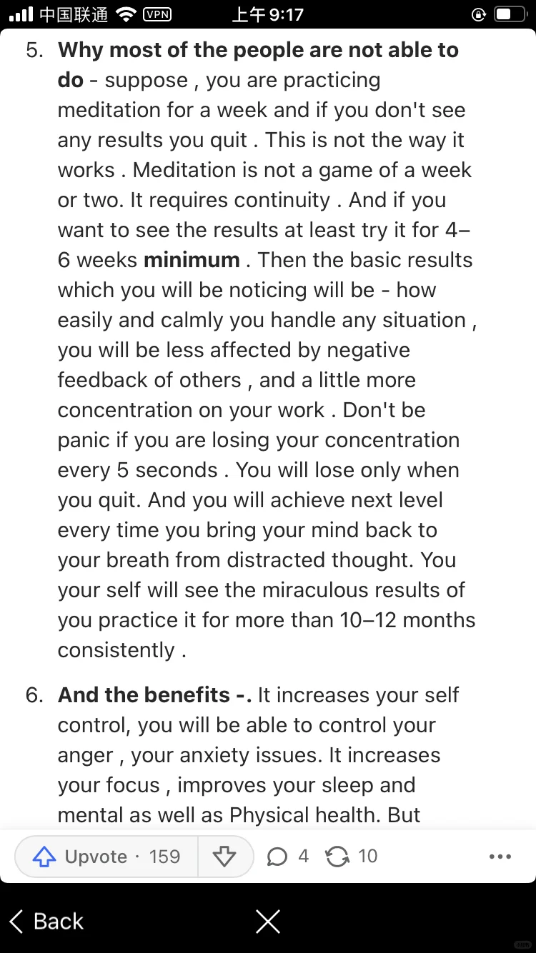 因为大多数人练习冥想一周,没有看到任何效果,就退出。冥想不是一两周的游戏。这需要坚持。如果你想看到结果,至少要尝试4-6周。