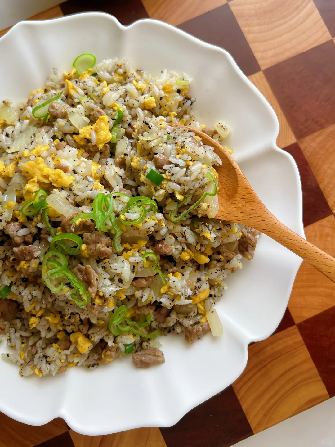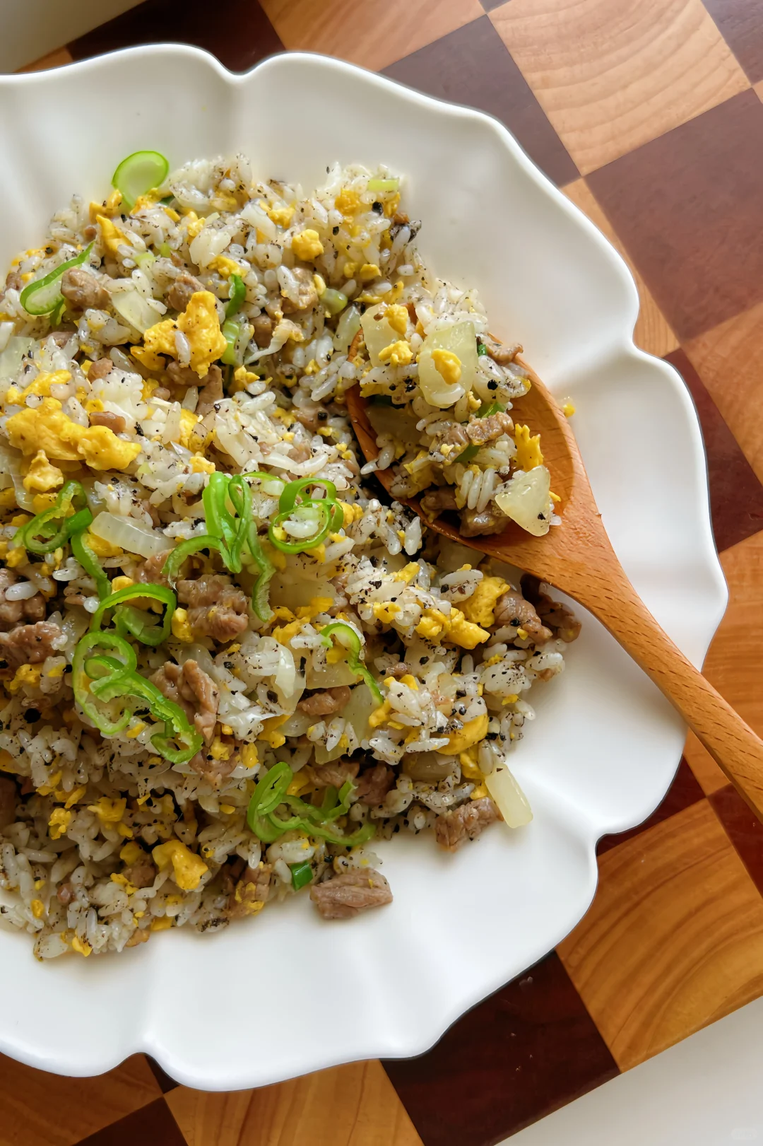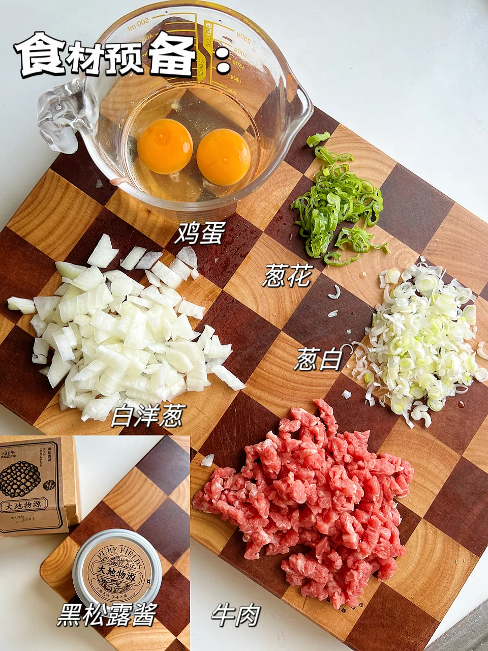 3️⃣热锅加橄榄油,下牛肉粒翻炒变色,加入洋葱末炒香,拨到一边倒入鸡蛋液,炒碎加入米饭,翻炒均匀,加入葱白、1-2勺黑松露酱、少许盐调味,翻炒均匀,出锅前加入葱花翻炒均匀即可