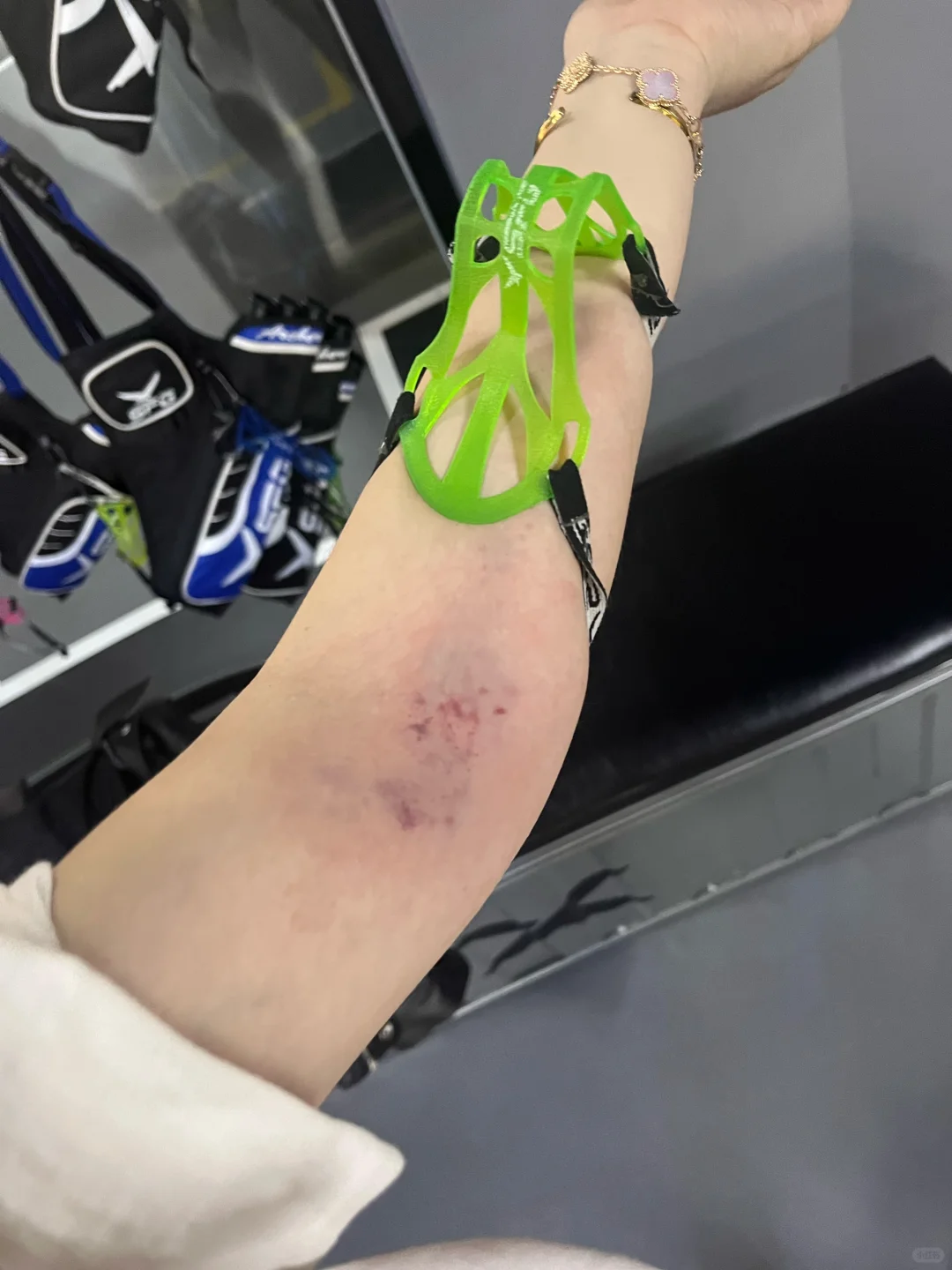 我小时候有一回手滑,没搭箭直接空放了,小臂内侧到掌末一条都黑了[doge](我手能黑,都是弓不能掉了,一瞬间握紧)我老师看到了还感叹:这手可真直,削出来的都是一条