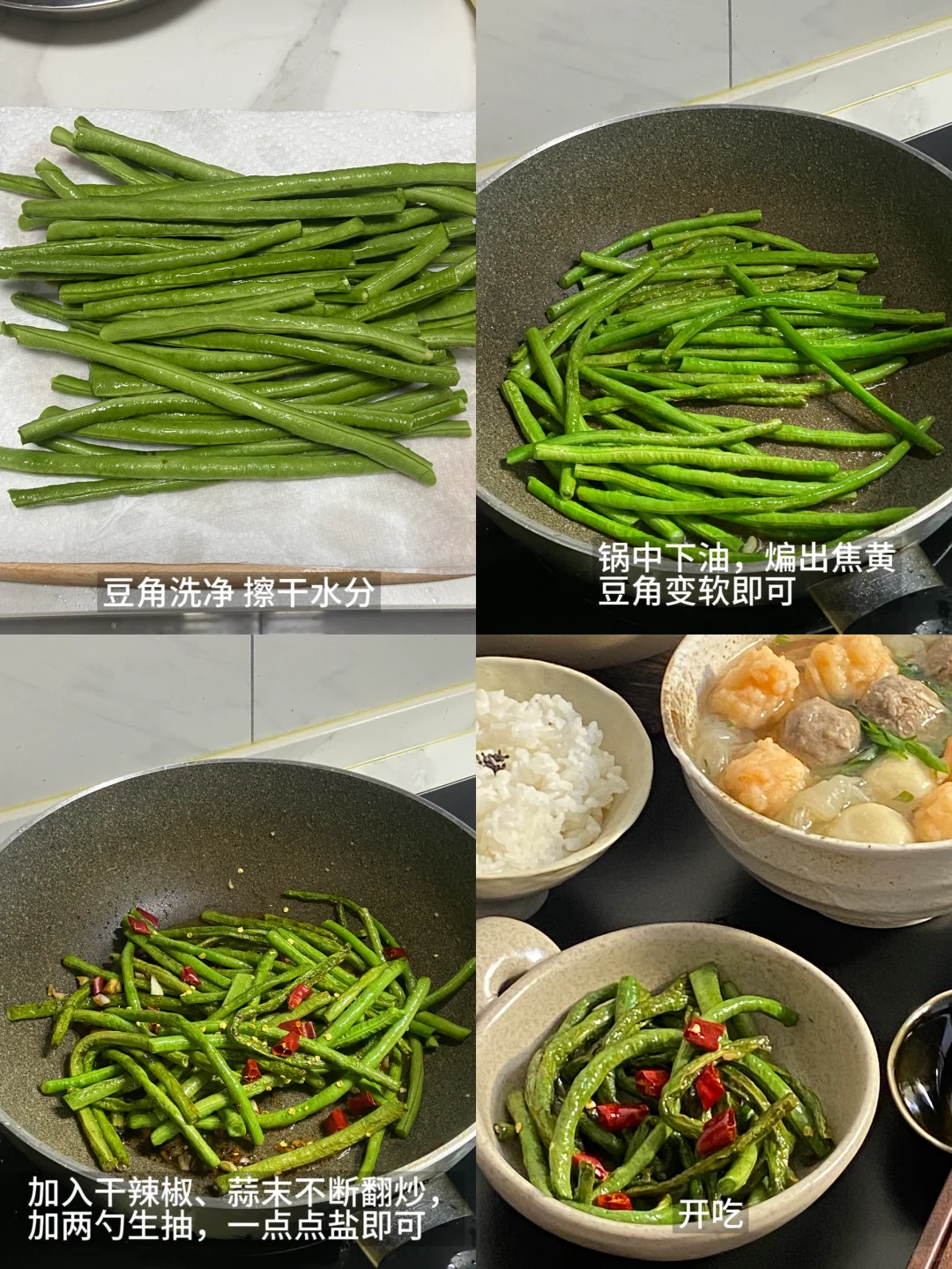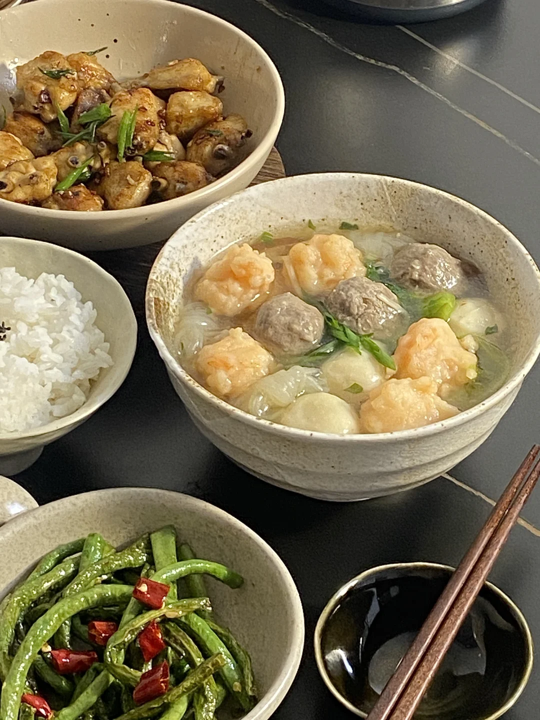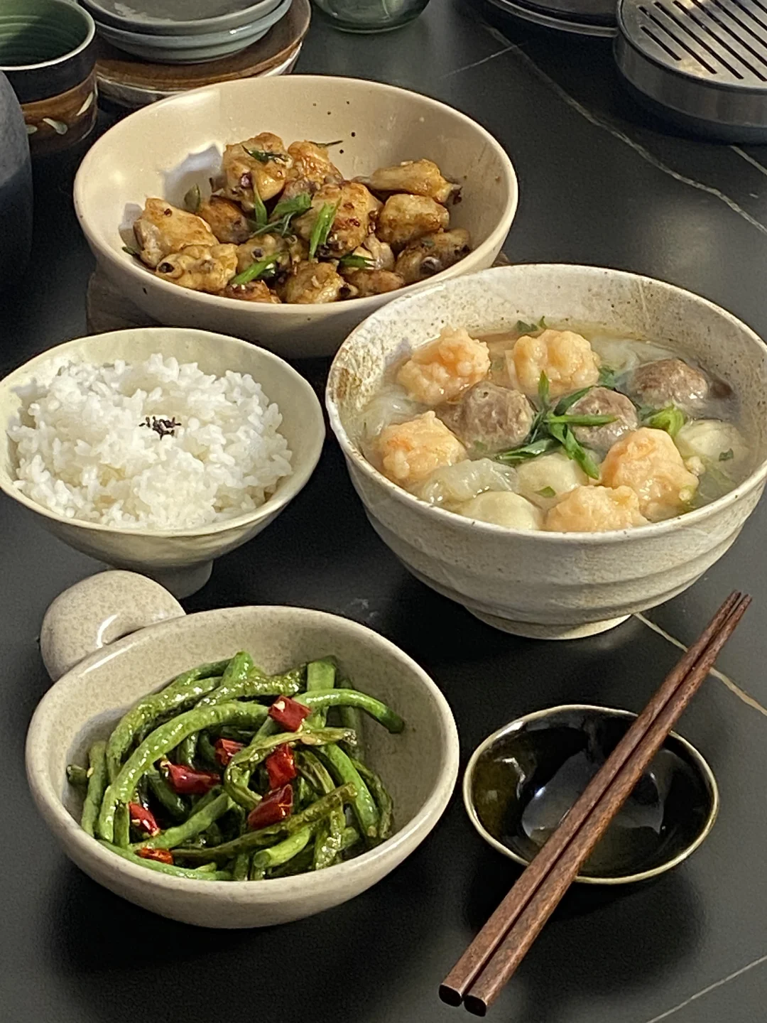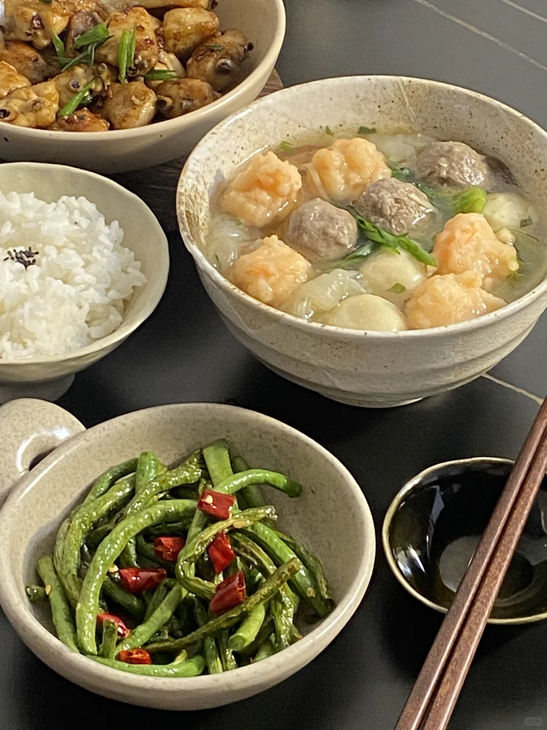 今日菜谱📜虾滑丸子汤香煎鸡翅干煸豆角🥢