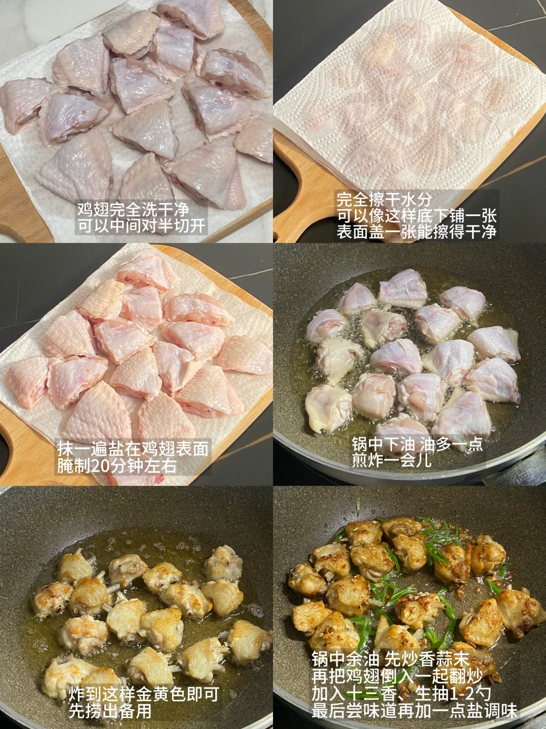 1)鸡翅完全洗干净,可以中间对半切开,完全擦干水分,用盐铺洒表面腌制二十分钟