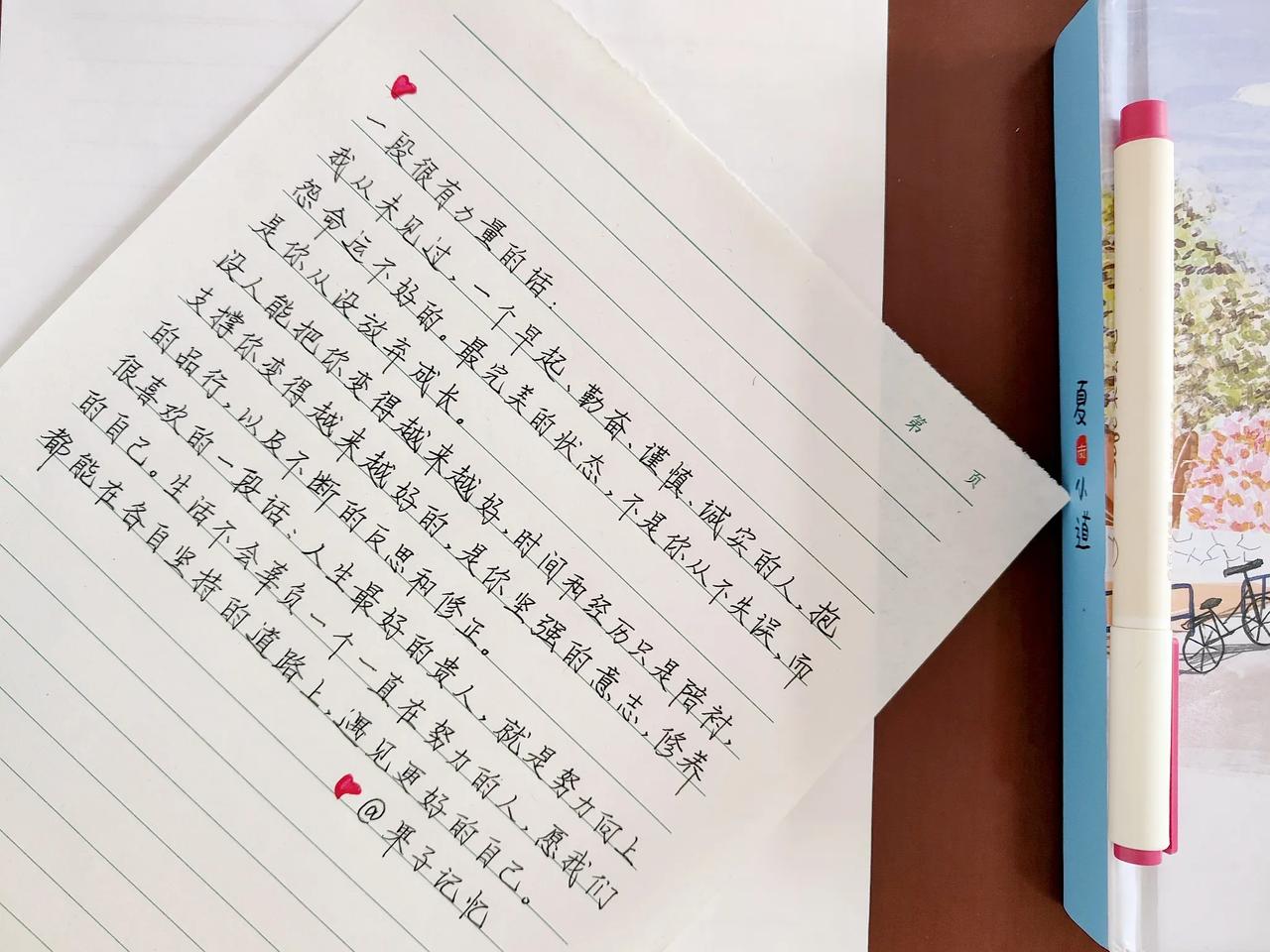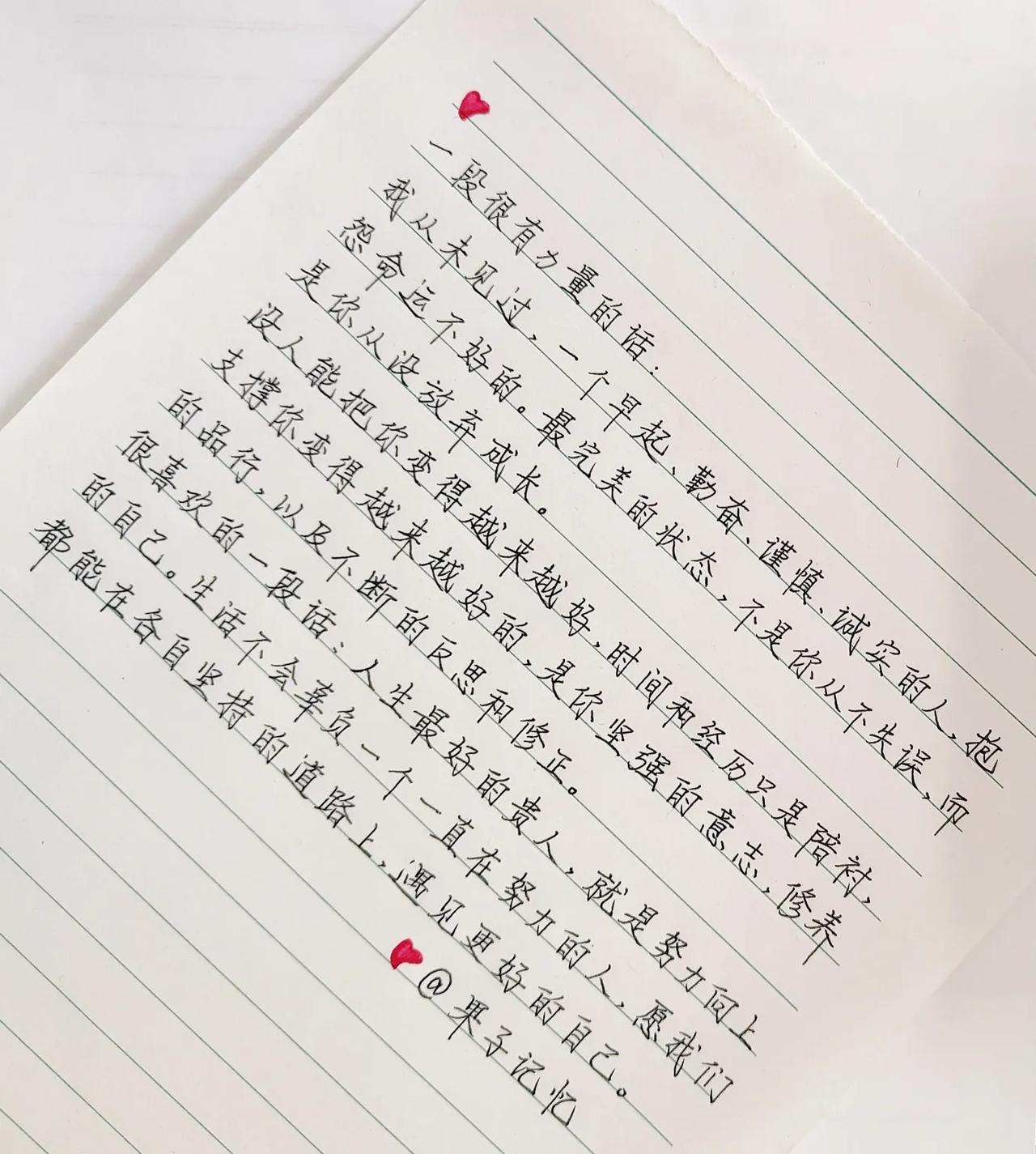 抄书练字打卡007次[礼花] 一段很有力量的话: 我从未见过一个早起、勤奋、谨慎、诚实的人,抱怨命运不好的。最完美的状态,不是你从不失误,而是你从没放弃成长。 没人能把你变得越来越好,时间和经历只是陪衬,支撑你变得越来越好的,是你坚强的意志,修养的品行,以及不断的反思和修正。 很喜欢的一句话:“人生最好的贵人,就是努力向上的自己。”生活不会辜负一个一直在努力的人,愿我们都能在各自坚持的道路上,遇见更好的自己。 #秋日抄书打卡##日常手写# #手写# #挑战31天练字打卡# #抄抄书 练练字 静静心#