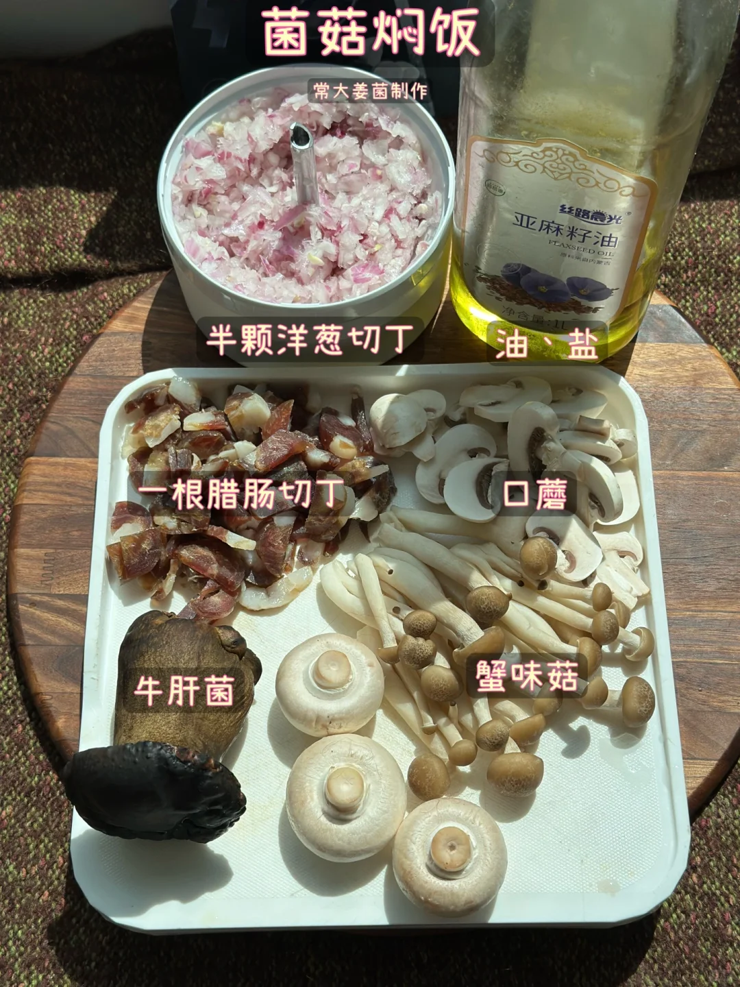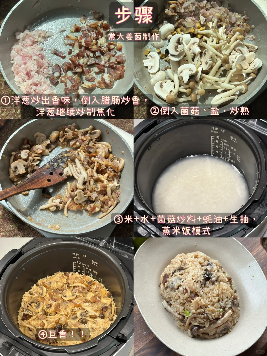 鲜的要命嘞!!!!~~ 本想着做奶油蘑菇意面的,一开冰箱奶油刚好用完🤣, 那咱们就直接做个焖饭吧🍚♨️ 用了三种蘑菇:口蘑、蟹味菇、牛肝菌,再加腊肠 直接给人香爆炸!!🥹🤩
