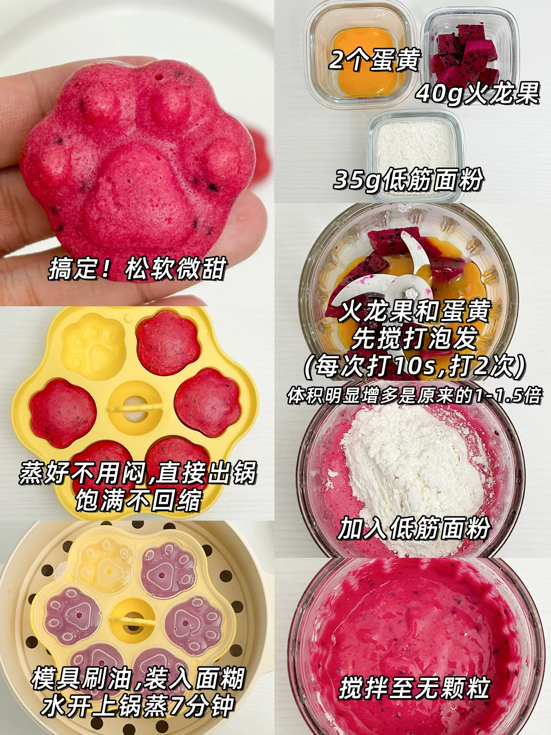 🚩注意点:搅打泡发这步很关键,基本搅打十几秒就行,过度打发体积会膨胀的比较大,蒸后回缩会很严重;全程都不用加水;蒸好不用闷,直接出锅;