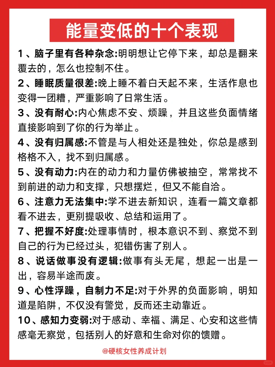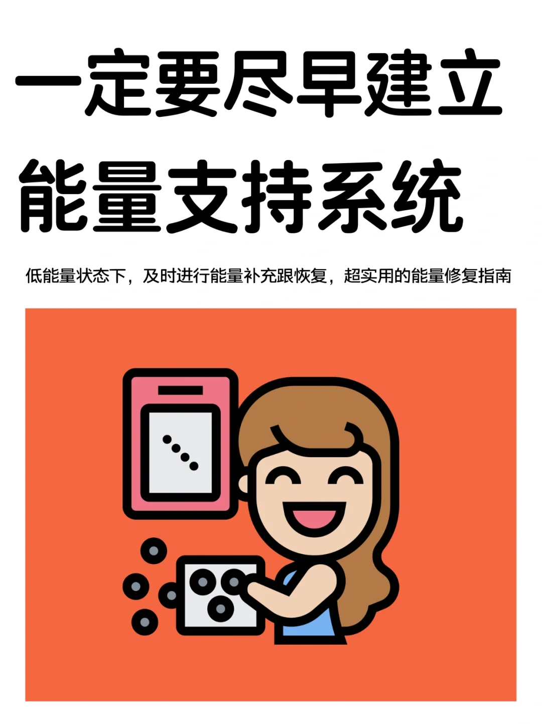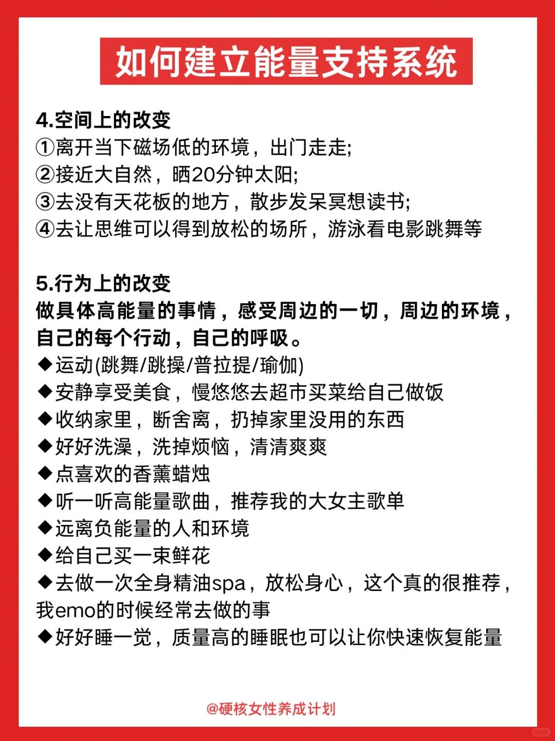 当出现情绪问题的时候,可以对照清单,一样一样去做,记录每次自己因为什么事情陷入低能量,又是如何摆脱的,这样下次低能量状态出现时,就能有条不紊地去解决。 自我支持系统可以让你更了解自己,清楚自己会因为什么而心情不好,就会有意识地平常去练习积极和好的思维方式、行动方式是什么,可以有效避免“断电时刻”的出现