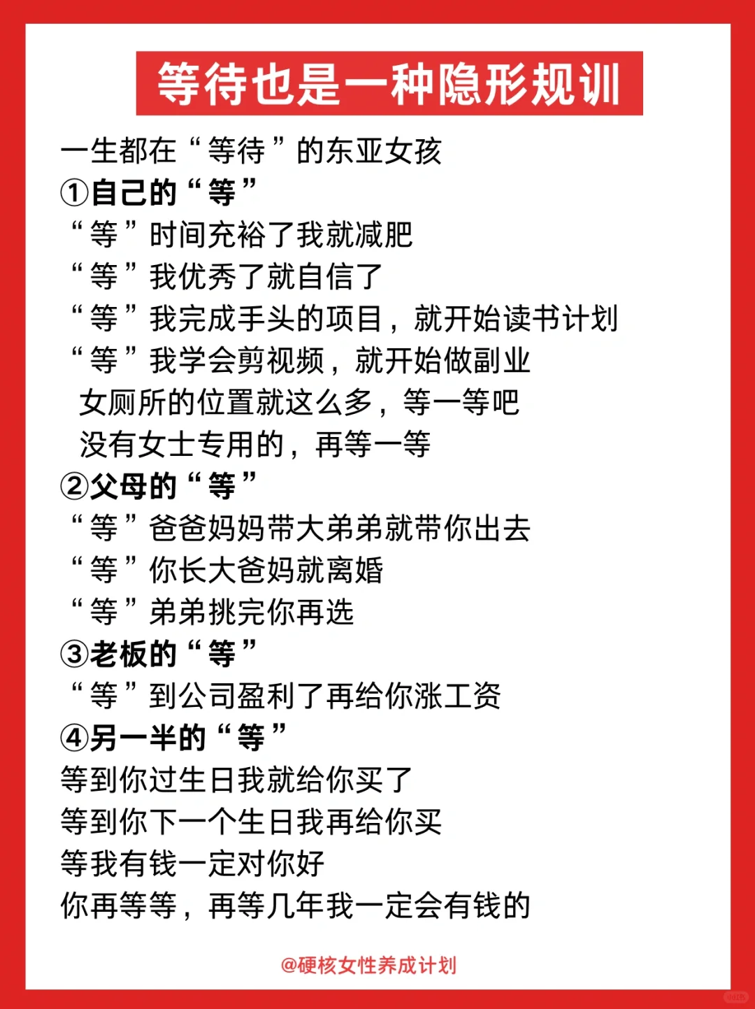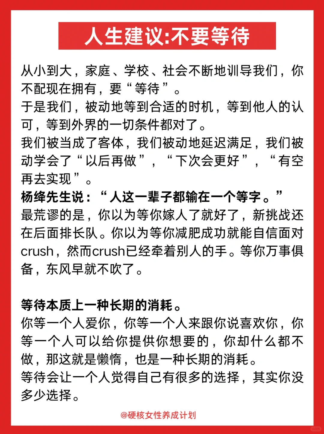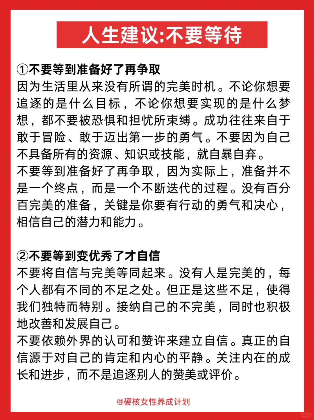 真正厉害的人应该是,有了目标不等待不犹豫,执行力惊人。想到什么就立刻去做,做错了立刻改。 希望大家都早点明白,生活不是在某个节点才真正开始的,而是每时每刻都在进行。 你不必等到男朋友从潜力股变成实力派,才敢确定自己的未来;也不必等到原生家庭的和解与道歉,才放下过往;更不必等到自己足够厉害,才拥有自信。 你现在就足够好,值得去过任何你想要的生活。