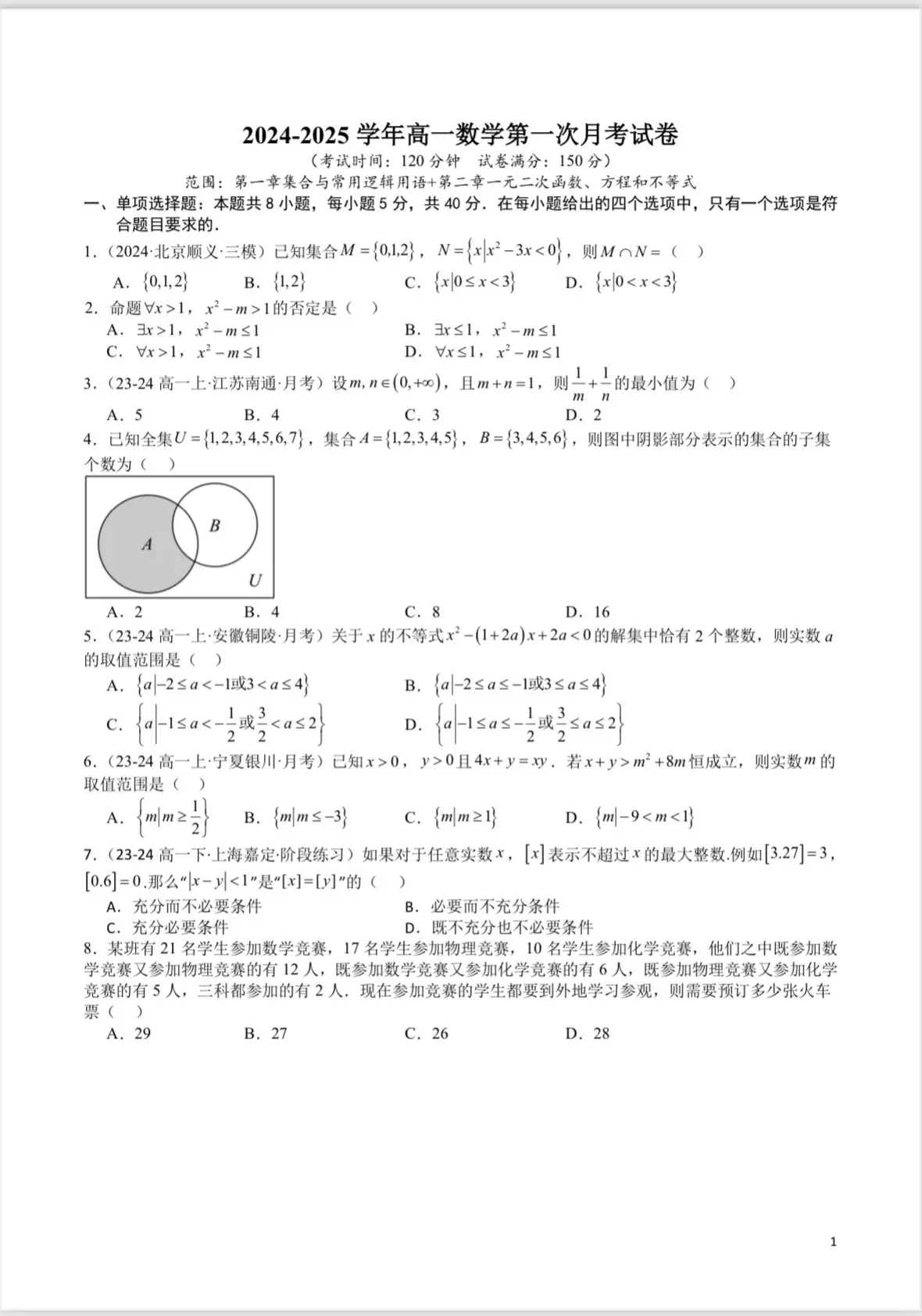 高一第一次月考试卷。高一的第一次月考还是很重要的,考好了,对高中数学的信心也会大大增加。这份试卷大家可以提前做,我们下周直播讲。