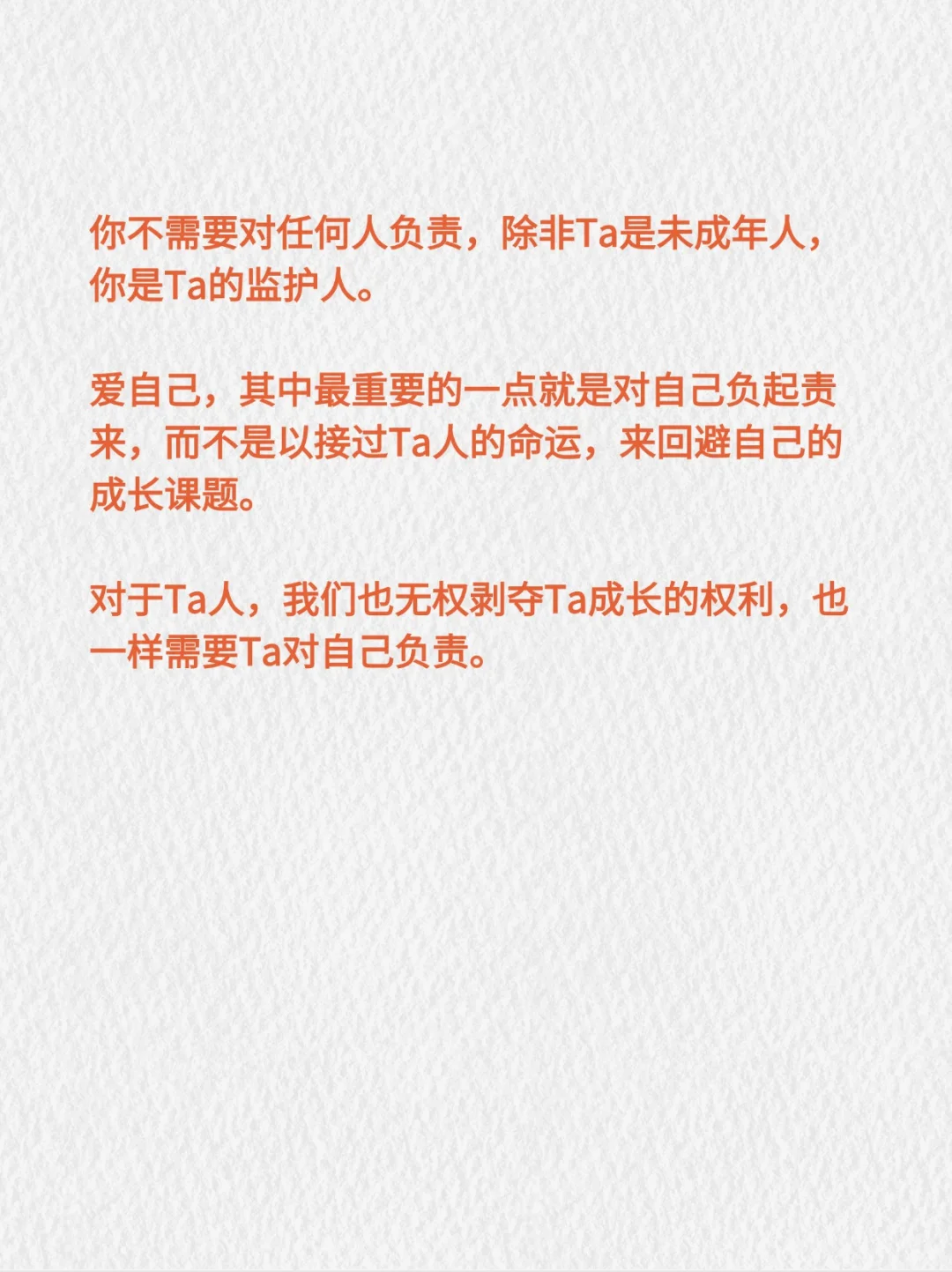 爱自己,其中最重要的一点就是对自己负起责来,而不是以接过Ta人的命运,来回避自己的成长课题。