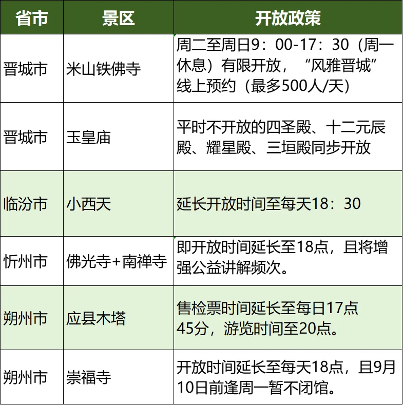 🔸临汾小西天、朔州应县木塔和崇福寺、佛光寺和南禅寺都延长了开放时间。