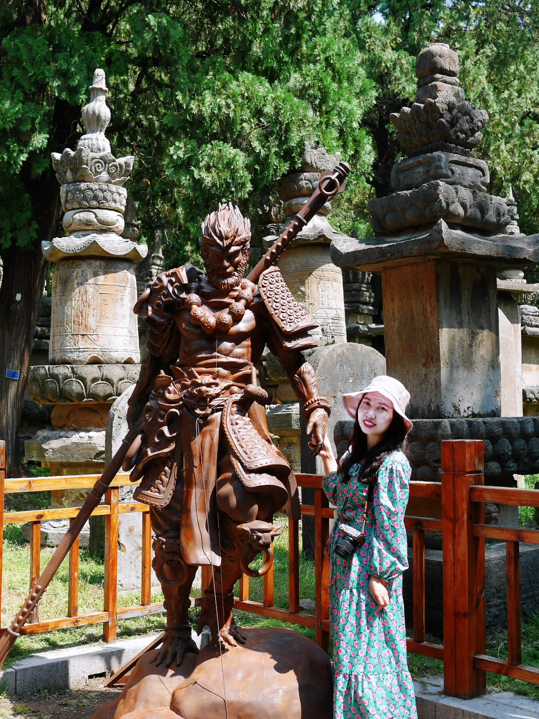 黑悟空取景的塔林里,直接立起了悟空雕塑,旁边有周边文创;33度高温下,工作人员cosplay黑悟空在拍短视频,果断合影!