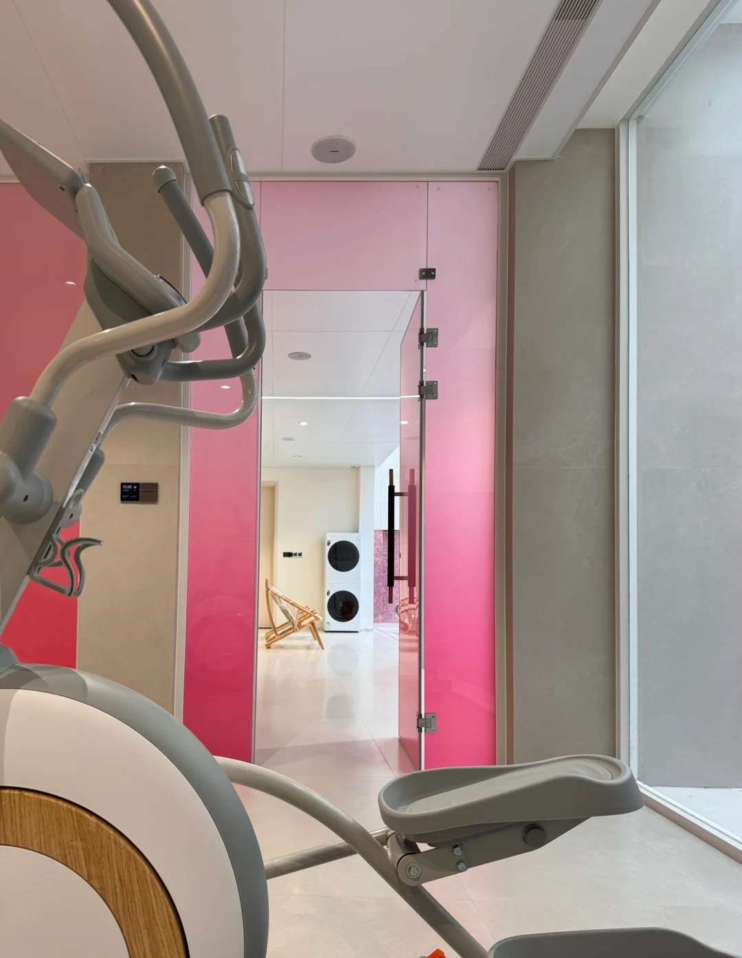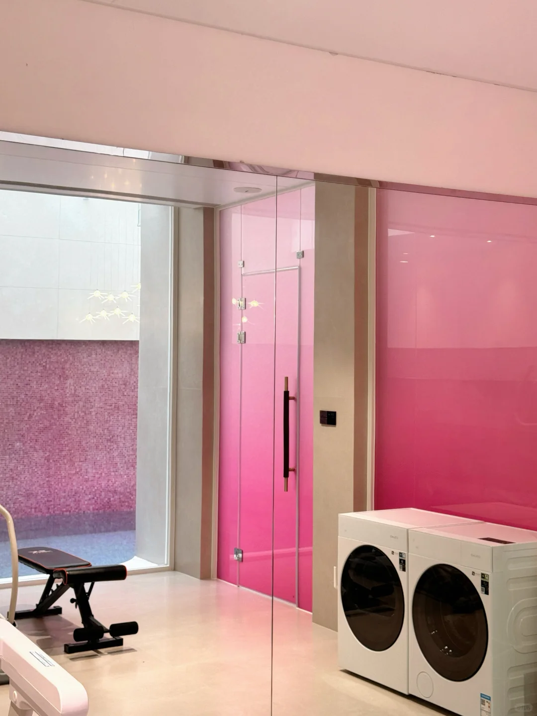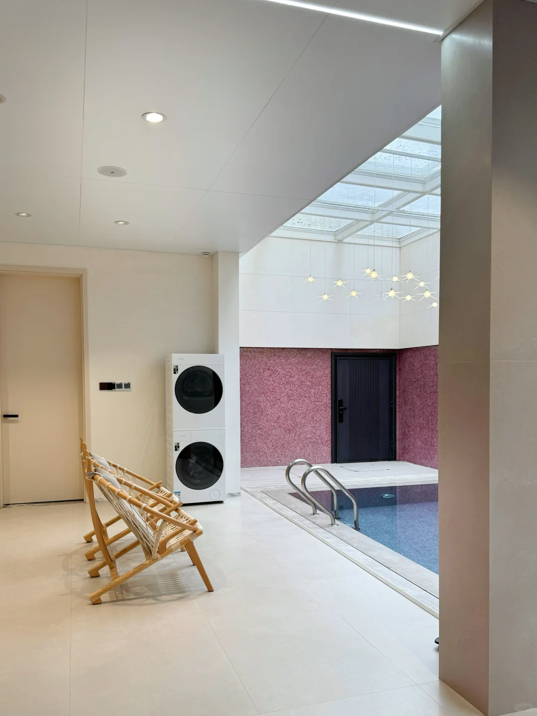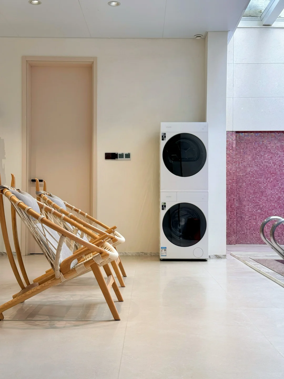 于是,我决定购买两套新的洗烘设备。我个人对家居美观🦋有着非常高的要求,对屋内每一处家电的颜值都有着严格的标准。最终,购入了两套COLMO云璃白洗烘套装。原有的洗衣房容纳不下这两套洗烘,就近放置在泳池区和健身房的区域。✨
