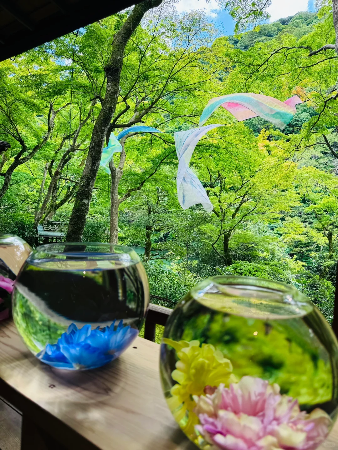 水缸、水镜,圆形窗户能看到整片日式庭院的风光和岚山的景色图