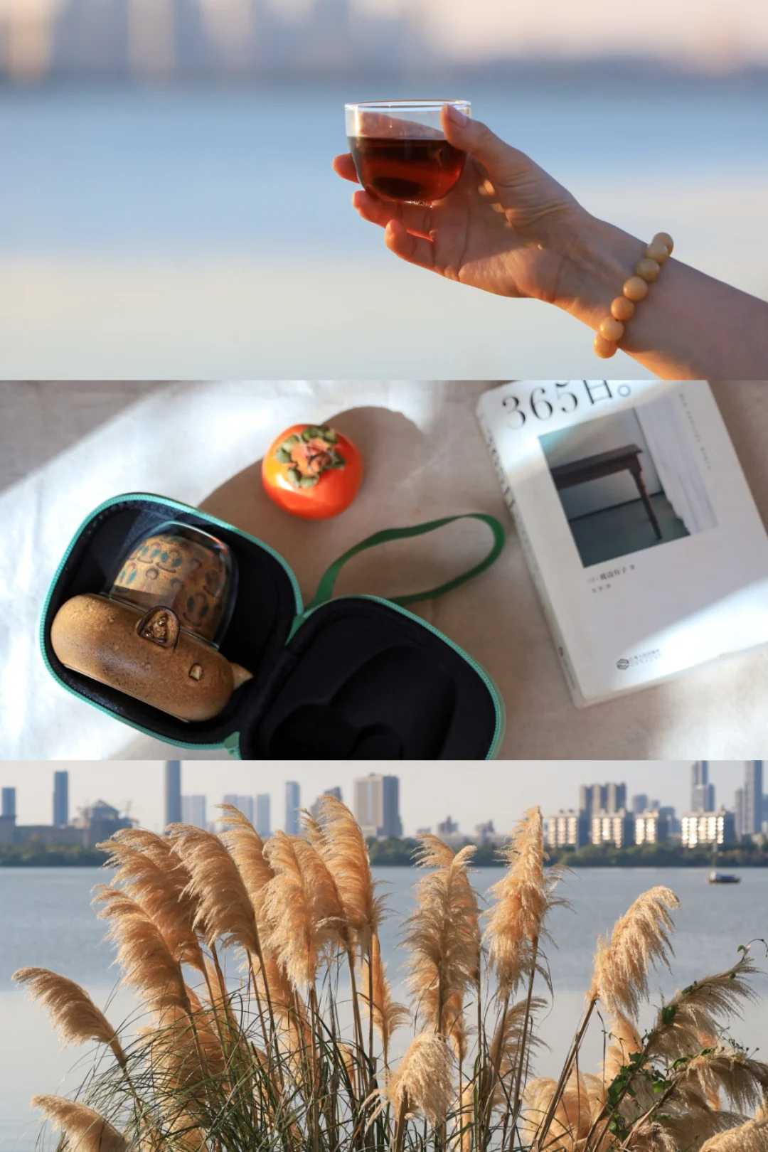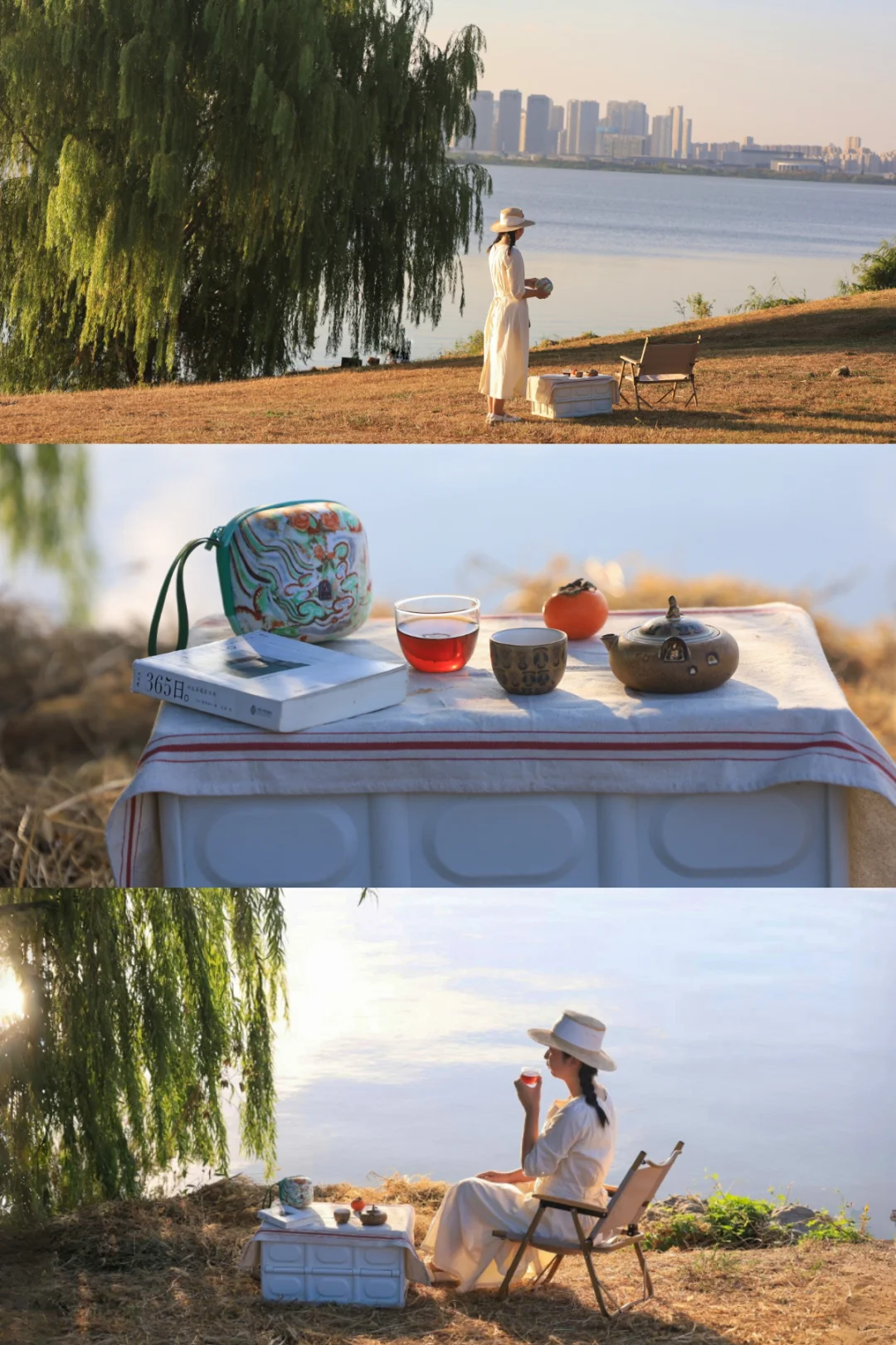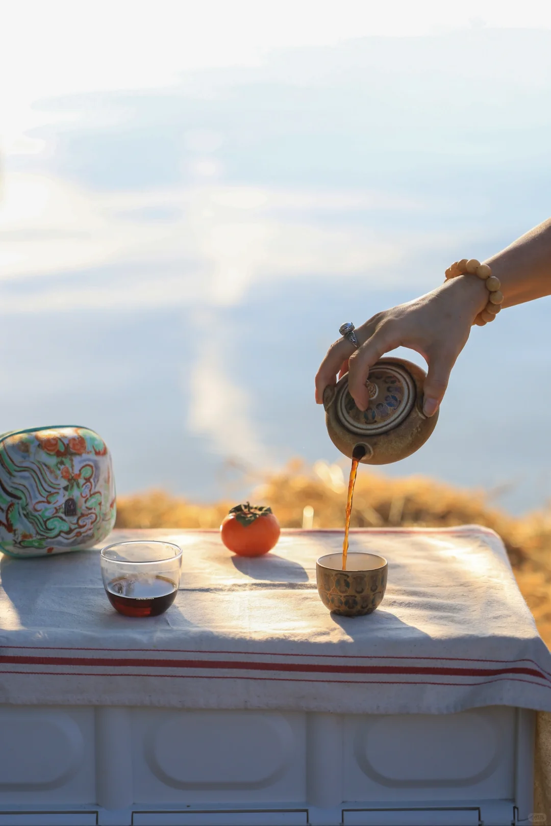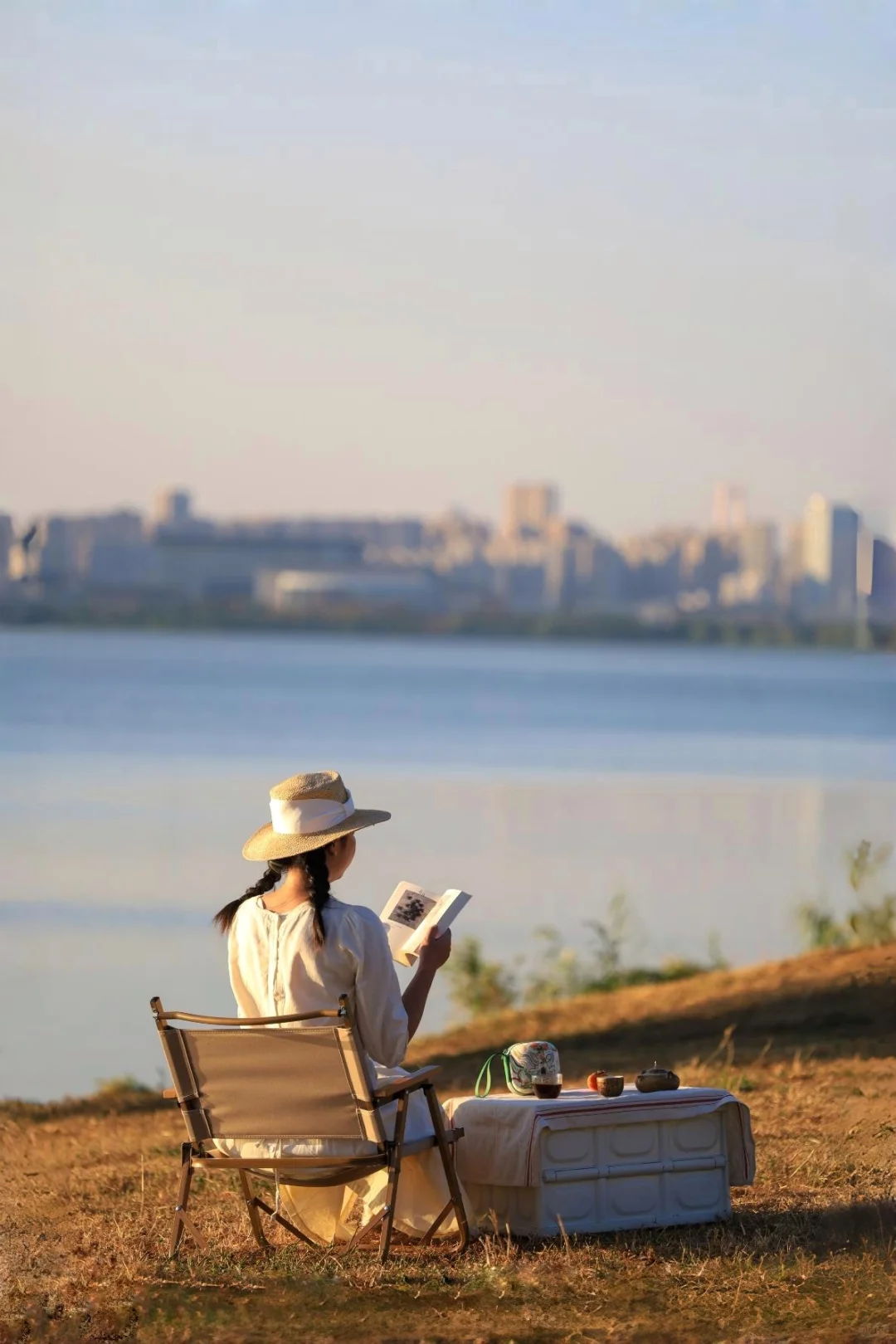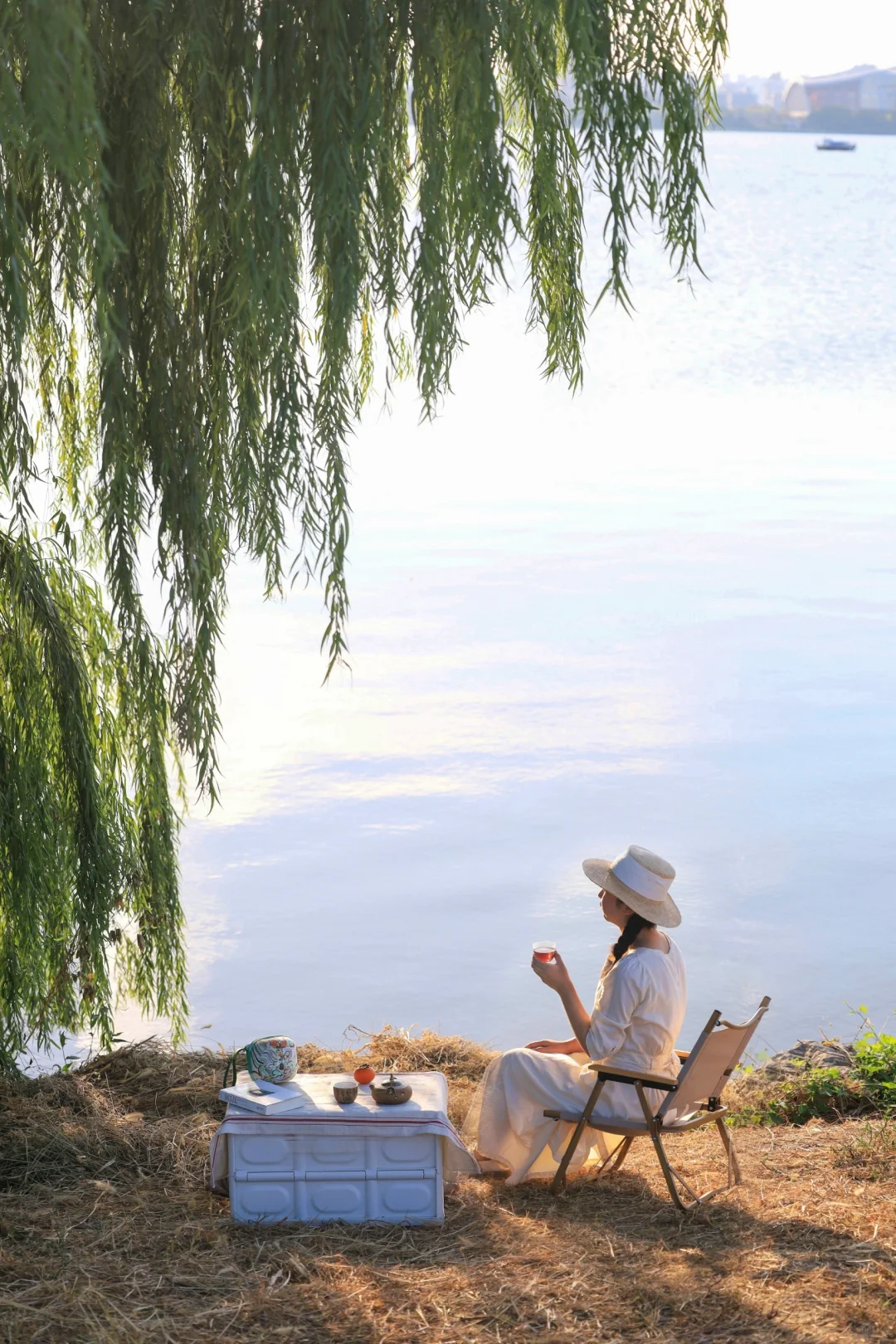 在湖边坐着喝茶