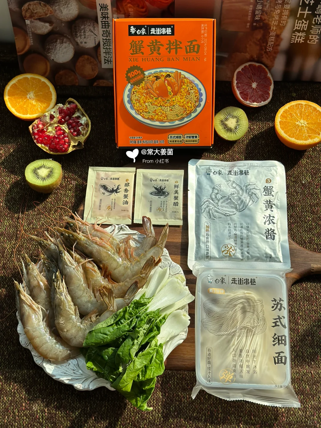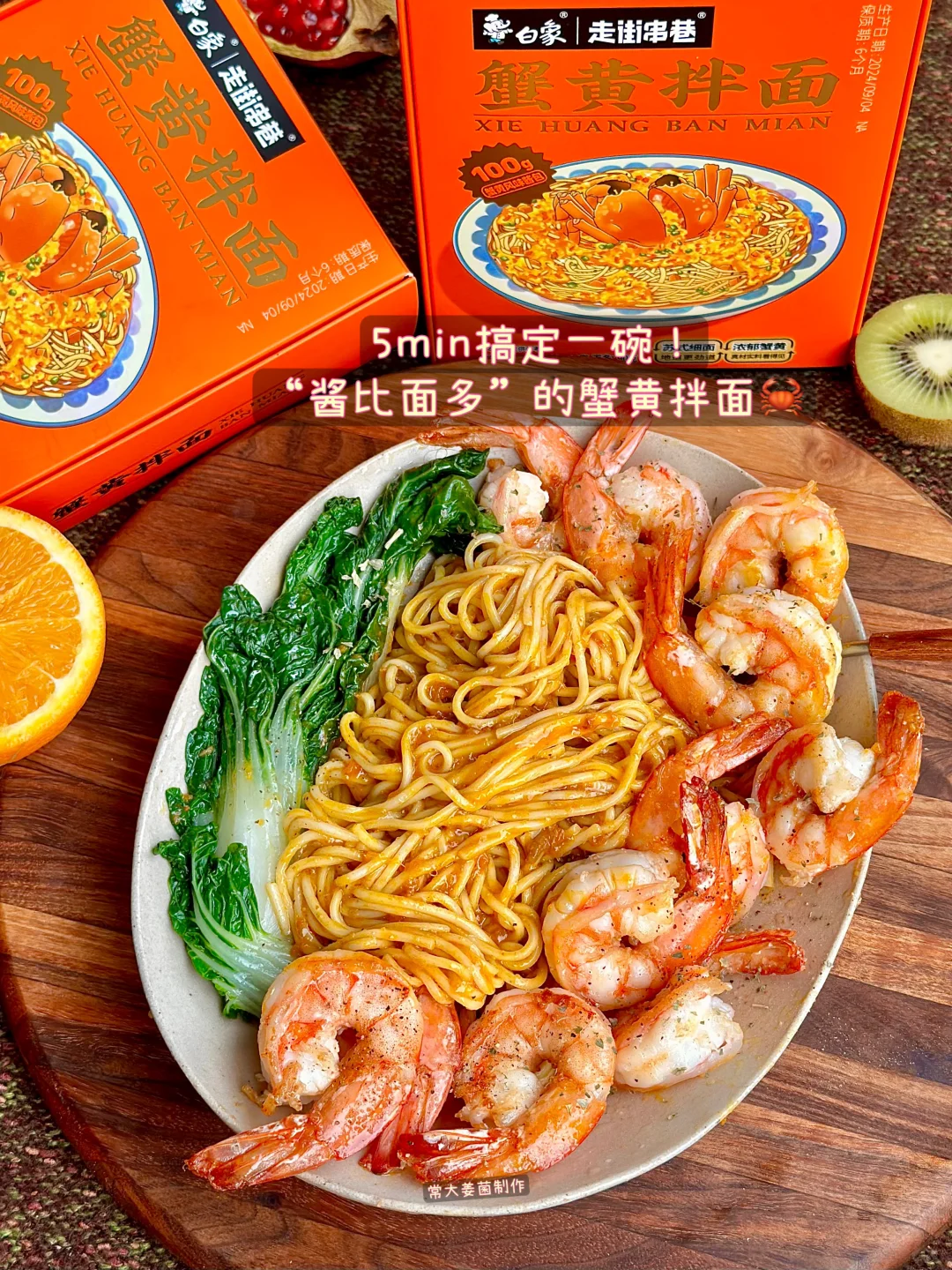 最近青岛开海了!🦀🦪🍤海鲜胃日日躁动 今儿吃个白象蟹黄拌面 佐 🍤海捕大虾+🥬奶油白菜 拌面里有100克蟹黄酱!真·酱比面多!!! 每一筷子都能吃到被酱厚厚包裹的面条,蟹黄香到上头~ 对了!面是非油炸的苏式细面哦~ 做法简单!5分钟左右搞定,在家也能吃上地道苏式蟹黄拌面✌🏻 嘿嘿,又一顿干净的好吃饭达成🥢 - 食材: 白象蟹黄拌面、虾、奶油白菜、黑胡椒盐 做法: ①将虾煎熟, ②起锅烧水,放入苏式细面煮5min捞出,蟹黄酱隔热水加热,淋入面中,加入蟹油蟹醋拌匀,撒葱花,摆上大虾和青菜,开吃喽~