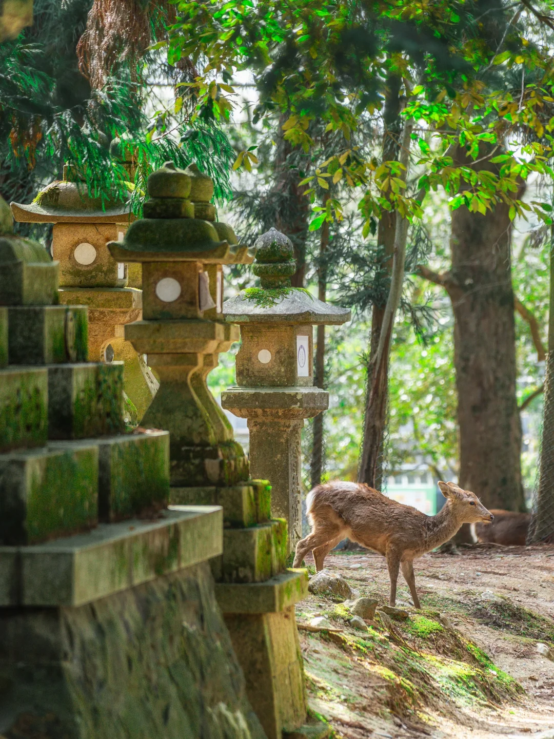 春日大社参道上的鹿,古树与石灯笼之间很有灵性