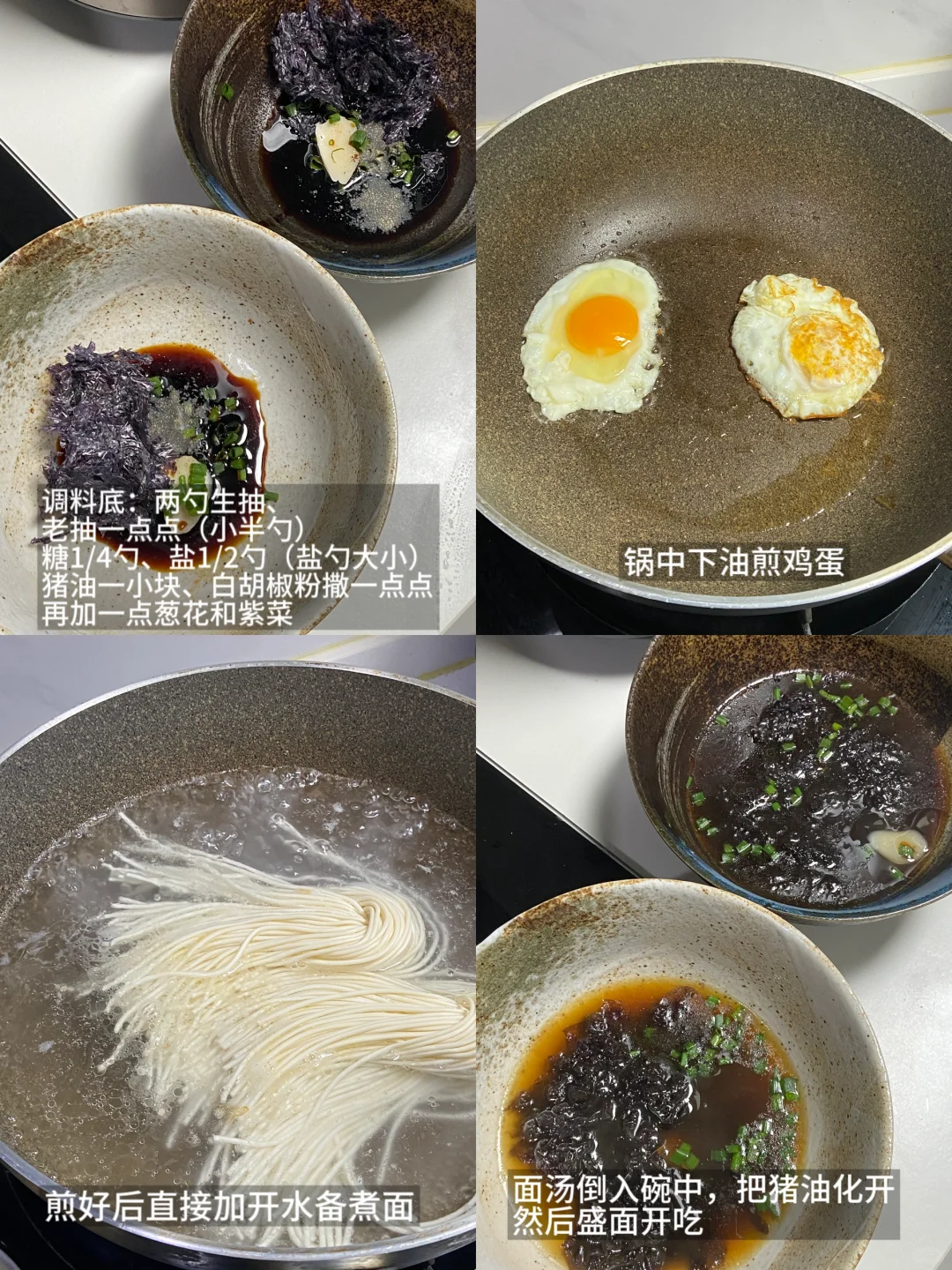 1)调料底:两勺生抽、老抽一点点(小半勺)、糖1/4勺、盐1/2勺(盐勺大小)、猪油一小块、白胡椒粉撒一点点,再加一点葱花和紫菜