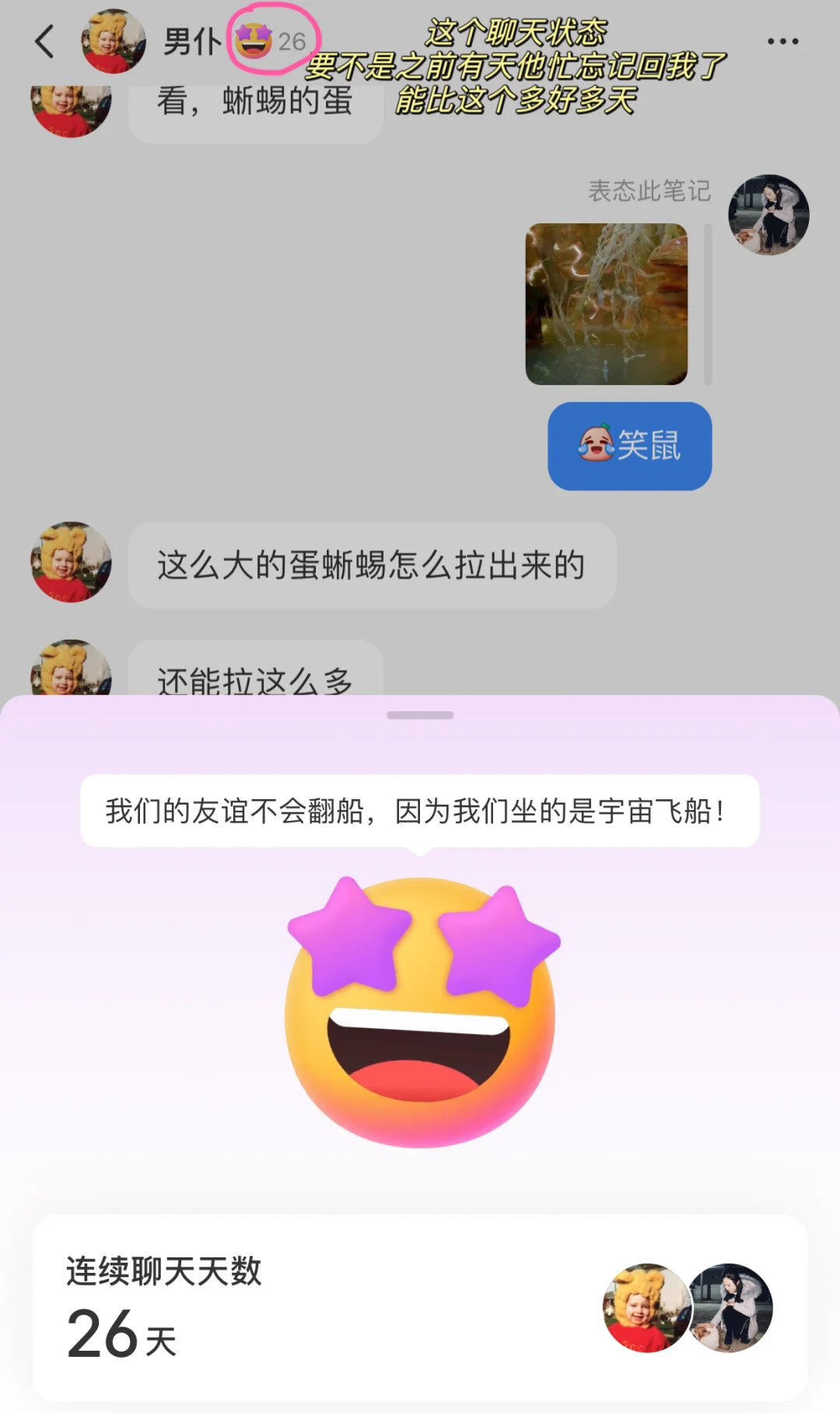 我最近痴迷新出的聊天状态,恨不得马上就把所有聊天状态都解锁,他特别配合得每天陪我在里打卡,比上班还积极,某次一忙没来得及打卡导致聊天状态结冰,他自责得跟个做错事儿的小孩儿一样,抓紧在零点续上火花:“快看!咱在养的小秃头又活过来了!我给它救活了!”