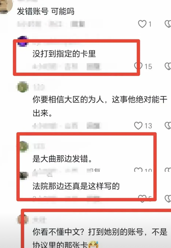 这事儿在网络上几乎传成笑话,张兰神点评说,这是我的亲孙子,我干嘛要在抚养费上坑孩子,做有损八辈子德的事,咱也干不出来!网友们七嘴八舌展开了辩论,有人说在法院真显示卡号打错了,是弯弯那边给错了号码。有网友纠正说 ,只是达到了大S其它的卡号,钱进了她的账户,只不过没有进指定的账户。还有网友神评论说——但凡见过曲曲的人,知道这种事儿,她干得出来!