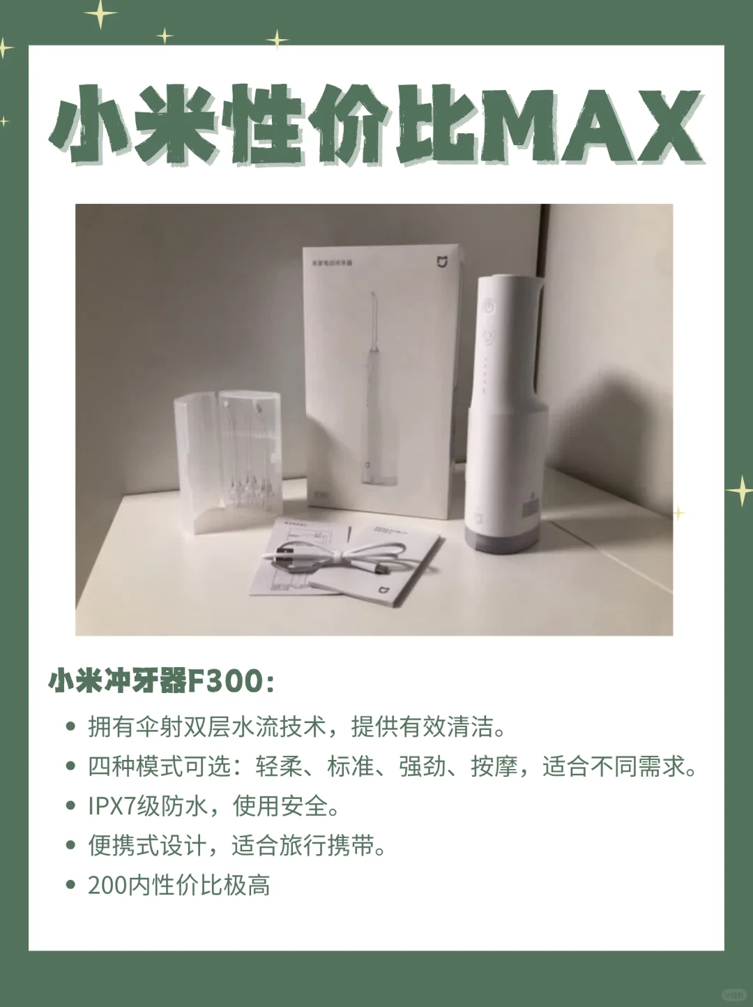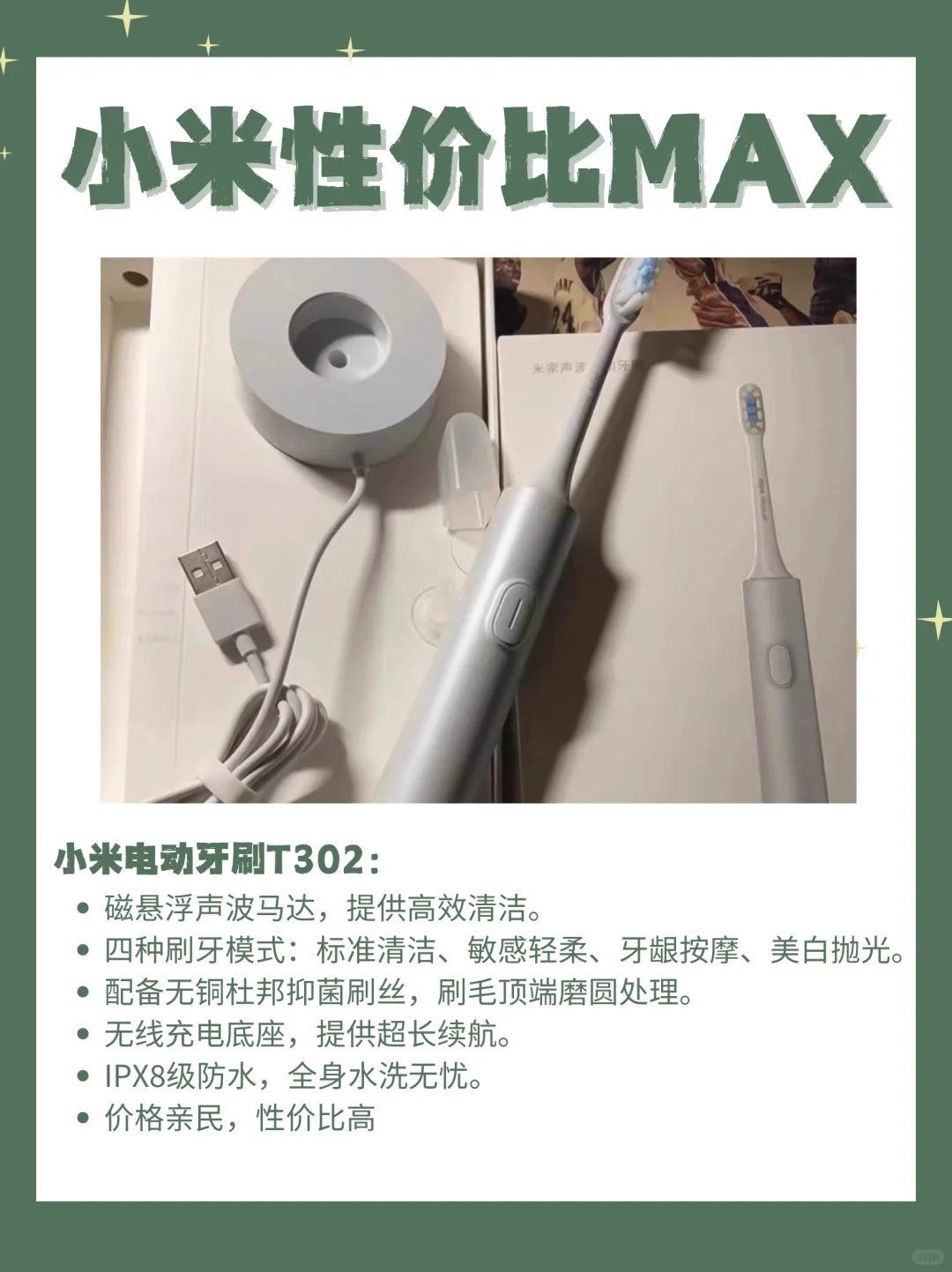 小米的T302电动牙刷和F300冲牙器就是不错的选择👍。T302电动牙刷有着优雅的紫色外观,配备的是无铜杜邦抑菌刷丝,刷毛软硬适中😌,而且续航能力超强,充满电后标准模式可使用65天,轻柔模式可使用150天🔋。它的智能定时提醒功能,能帮助你科学刷牙🕒。
