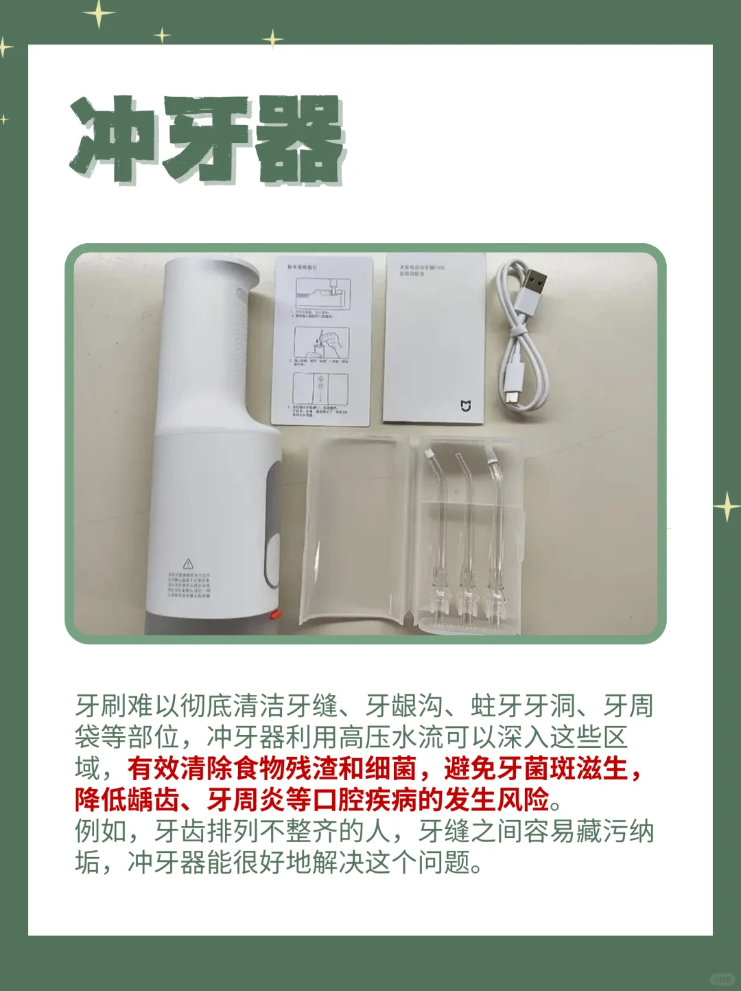 冲牙器则能够深入清洁牙缝和牙龈沟👀,对于佩戴牙套或者有牙周疾病的人来说,简直是救星🌈。它不仅能够清洁那些牙刷难以触及的地方,还能按摩牙龈,促进牙周健康🌿。而且,冲牙器用起来很温和,不会像传统牙签那样扩大牙缝🚫。