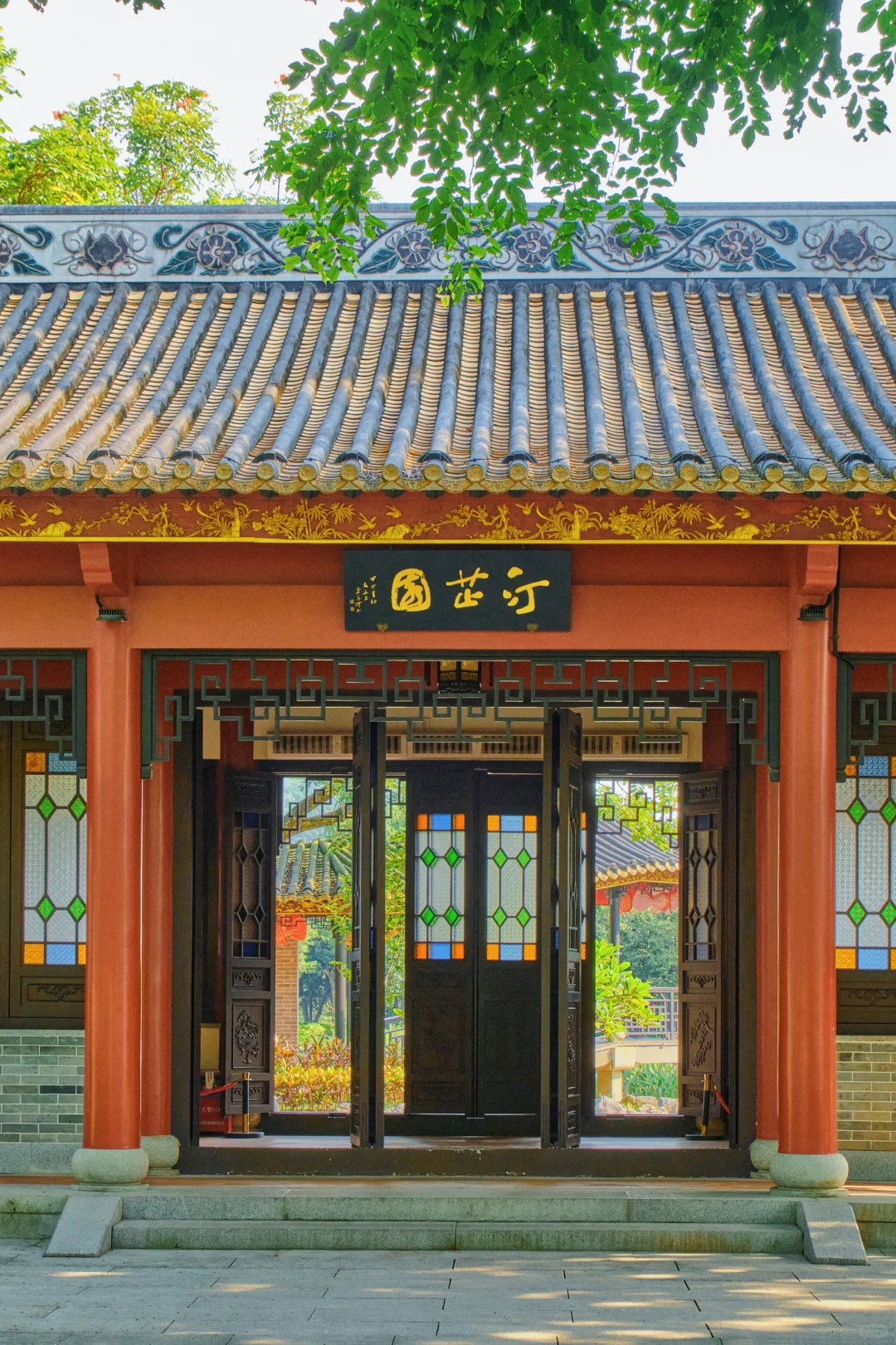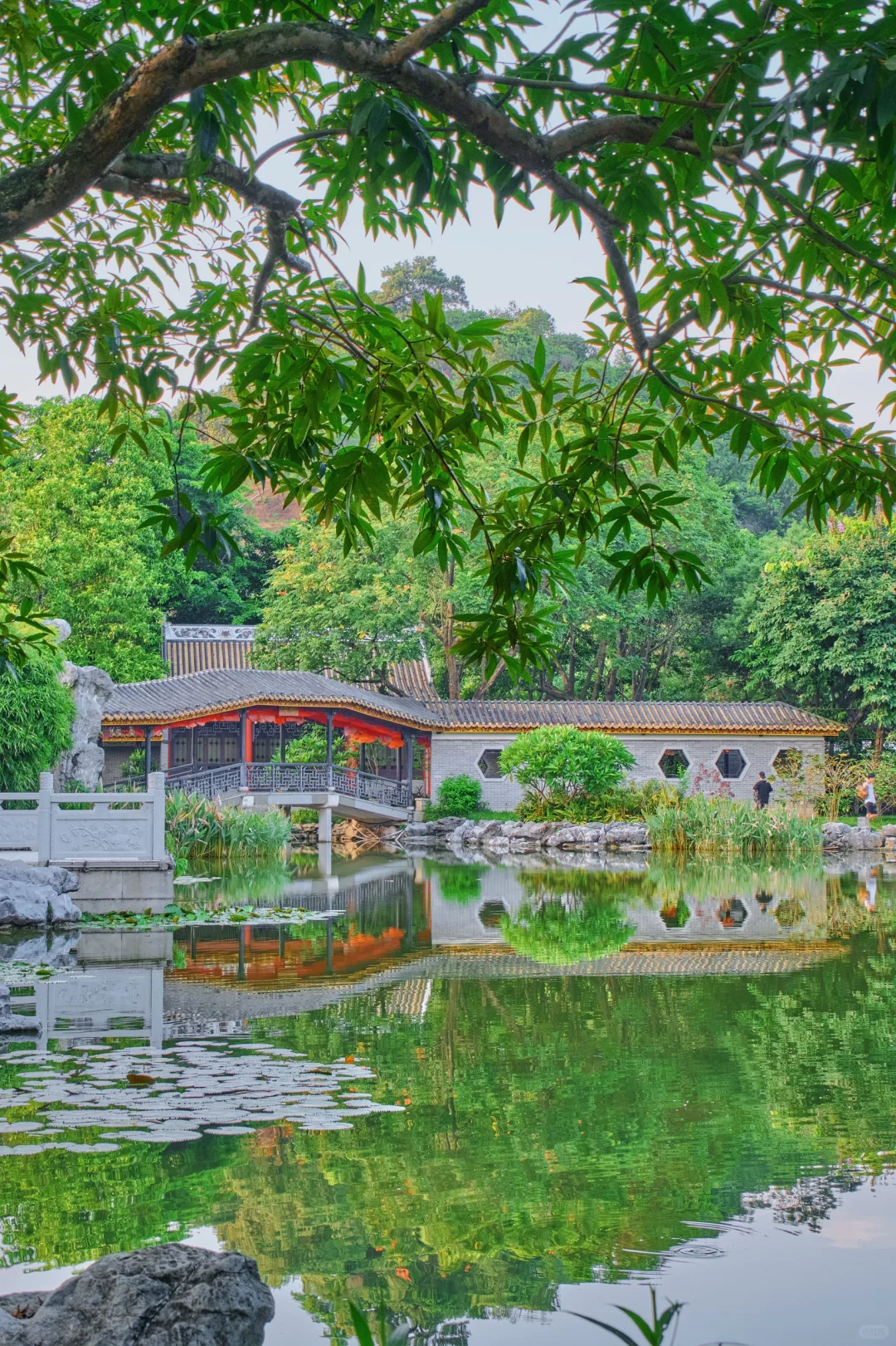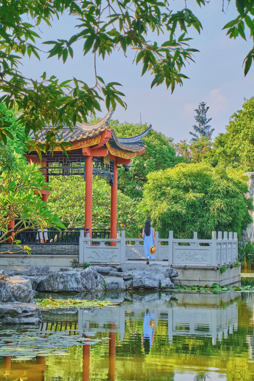 往前走便是汀芷园,简直是静谧中的诗意栖居,岭南建筑古风在这里体现的淋漓尽致,假山、亭台、楼阁、花木,湖水清澈见底,倒映着蓝天绿树与岭南古建筑,宛如一幅精美的水墨画。