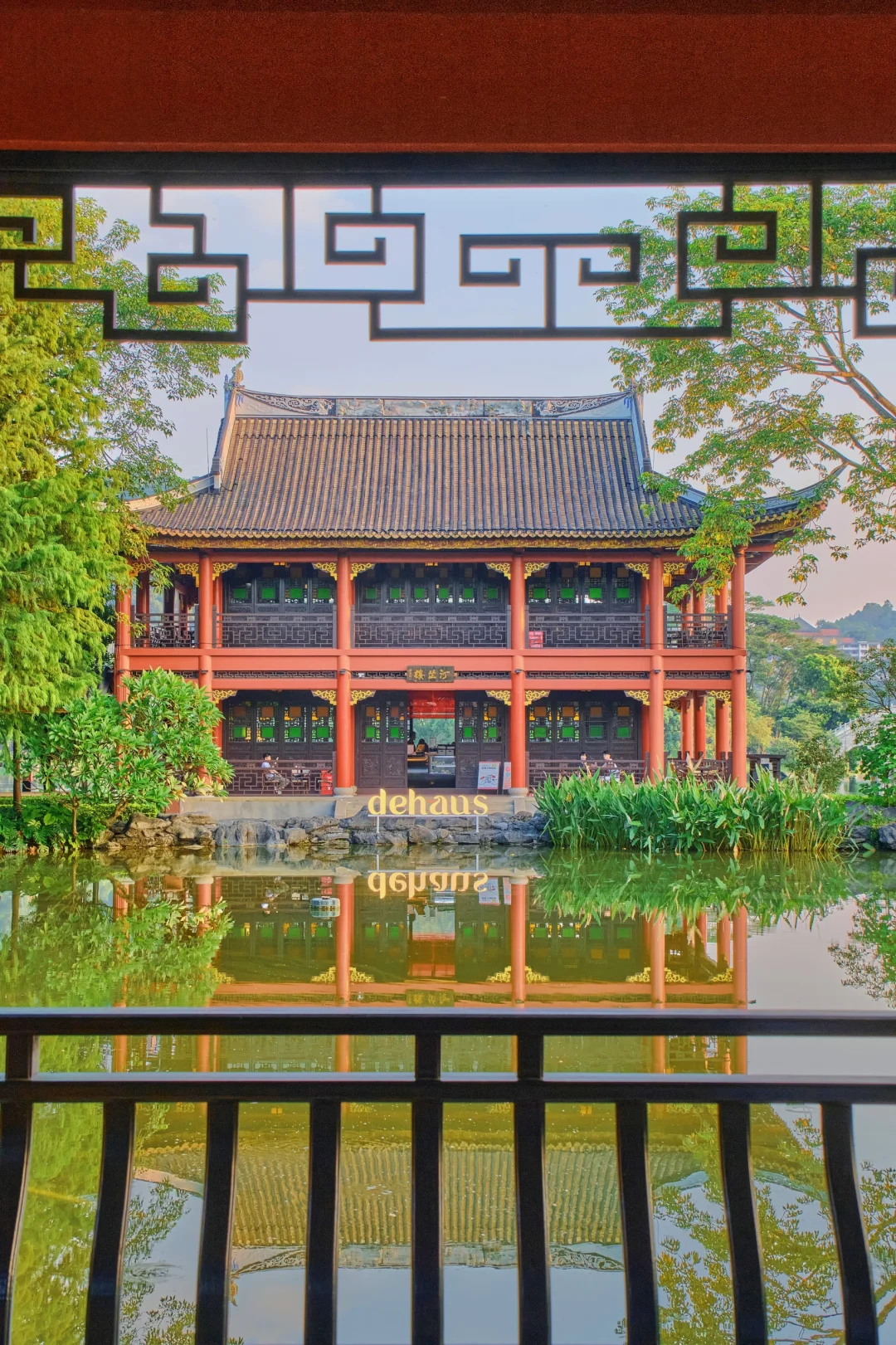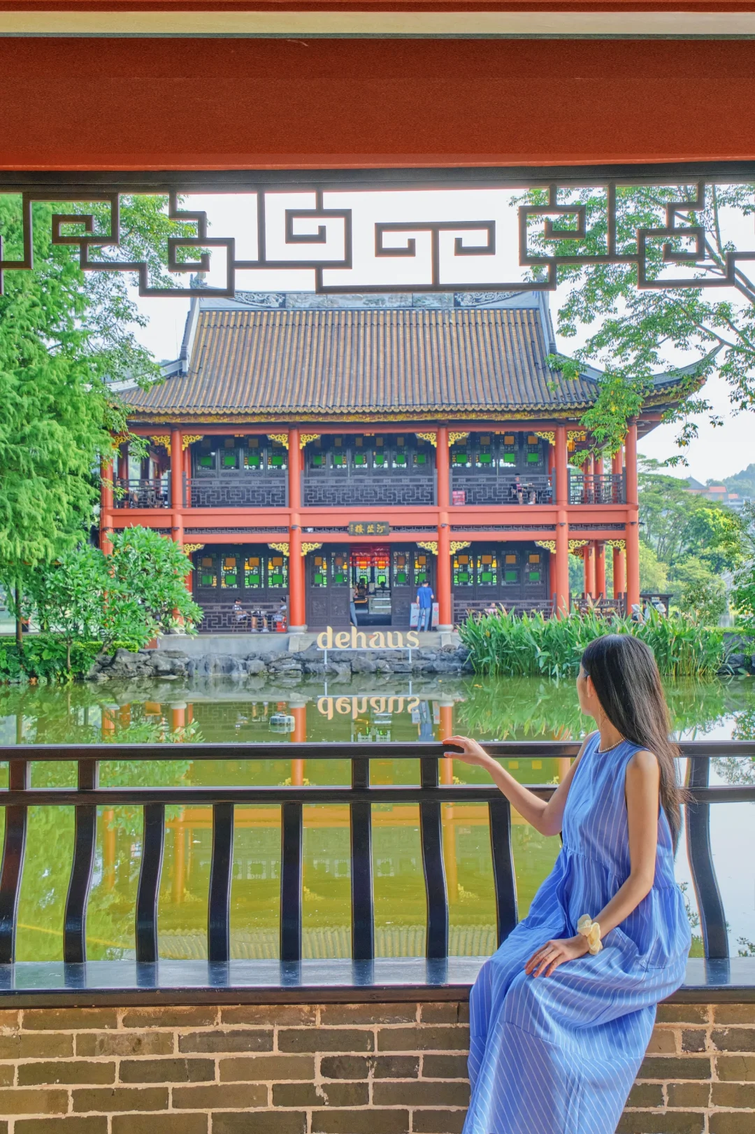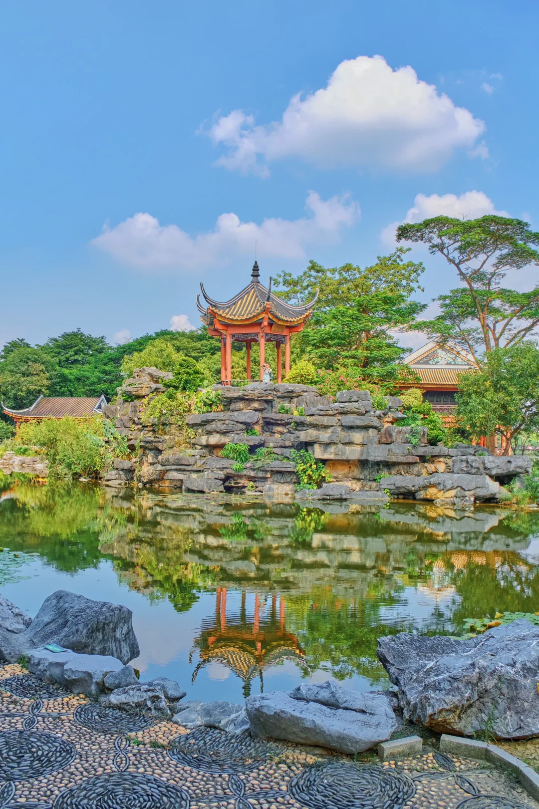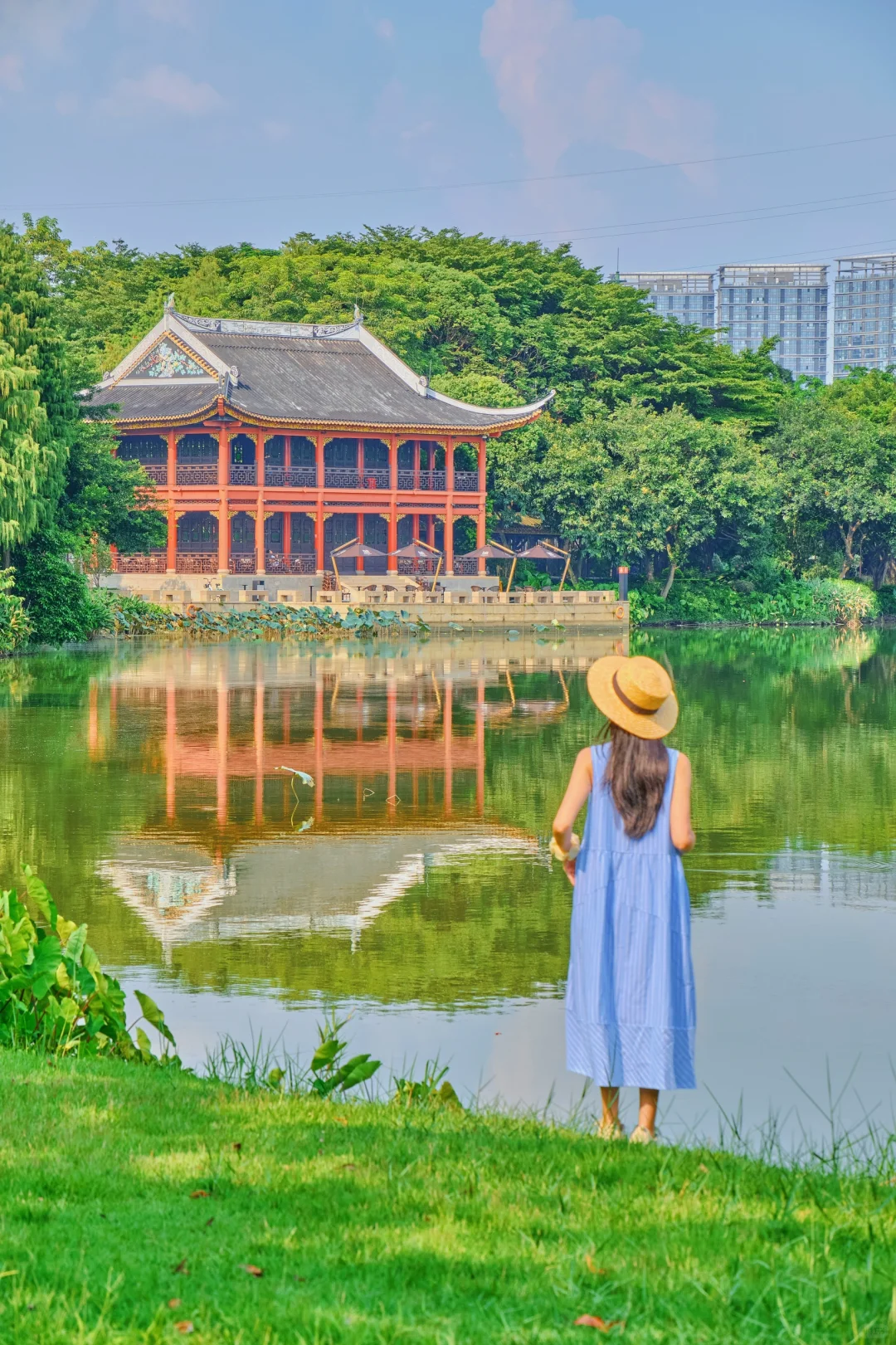 往前走便是汀芷园,简直是静谧中的诗意栖居,岭南建筑古风在这里体现的淋漓尽致,假山、亭台、楼阁、花木,湖水清澈见底,倒映着蓝天绿树与岭南古建筑,宛如一幅精美的水墨画。