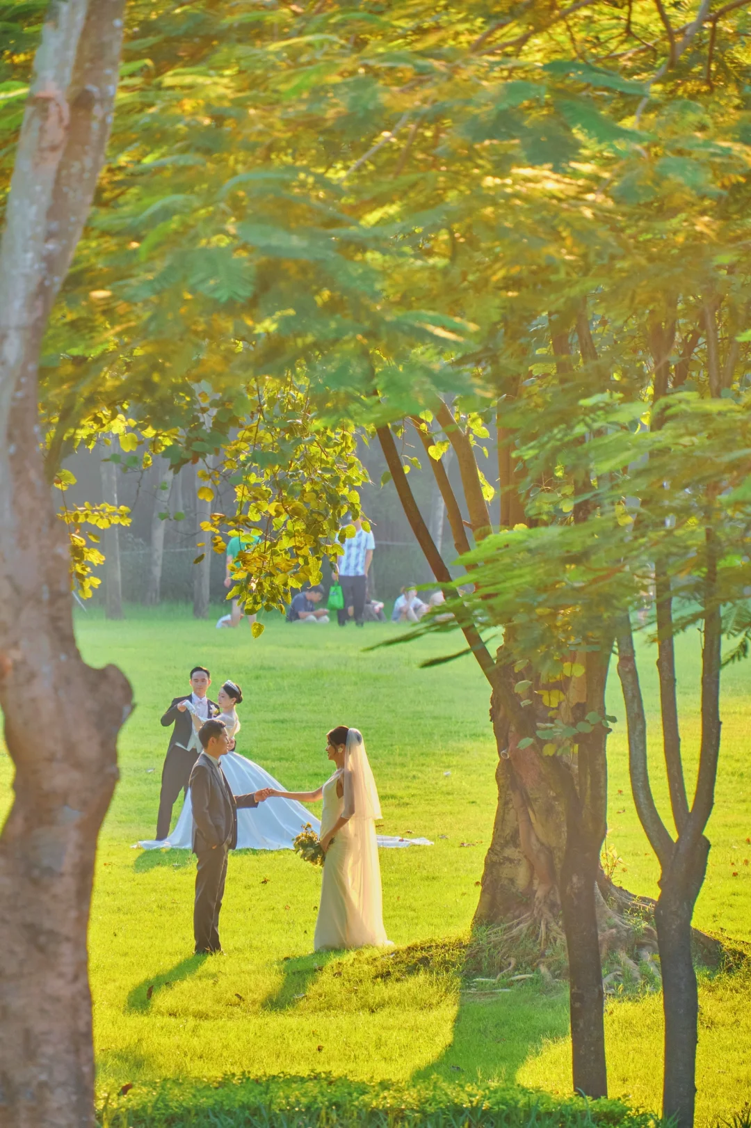 傍晚时分,夕阳如金🌅洒在那片宽广的大草坪上,每一根草尖都闪耀着温柔的光芒。不少人来这里拍婚纱照,真的既治愈又浪漫❗️