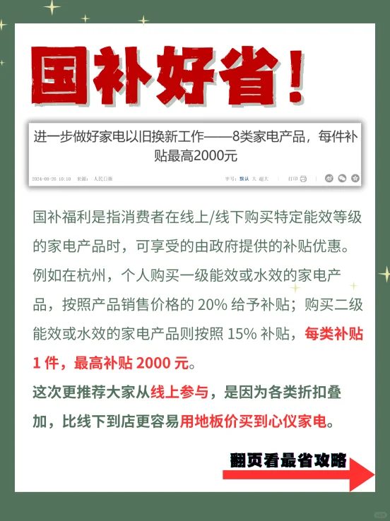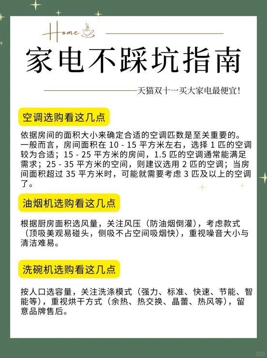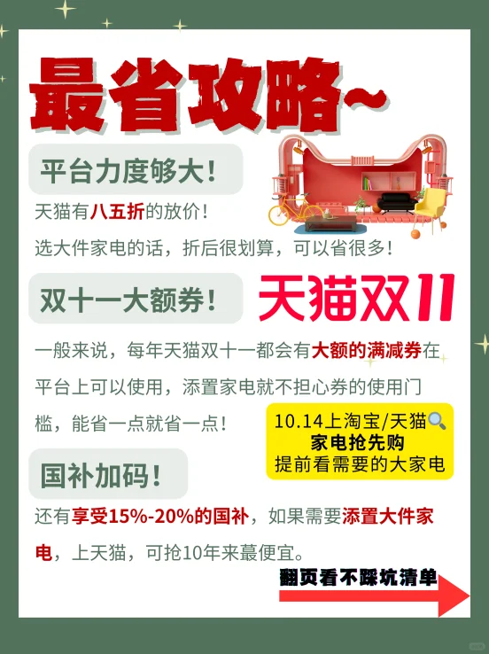 双十一预热开始,又到了买买买的时候了!今年买大家电上天猫绝对是超值之选,国补加上双十一的各种优惠,简直太划算了🎉!下面就给大家详细说说购买大家电的省钱诀窍和注意事项哦😎。 国补可是个大实惠呀💰!在购买大家电时,要留意哪些产品符合国补条件,享受这个福利能为你省下不少钱呢😏。天猫上的商家都会清晰标注可享受国补的产品,大家下单时仔细查看相关信息就好啦🧐。 家电市场品牌众多,同一类家电不同品牌和型号之间差异较大🤔。在天猫选购时,不要局限于某一个品牌,要多看看、多比较👀。综合考虑产品的性能、价格、售后服务等方面。例如电视,要关注画质、显示技术、分辨率、刷新率以及智能功能等;冰箱要考虑容量大小、制冷方式、能效等级等;空调则要关注匹数是否合适、能效比高低、是否有自清洁和智能控温等功能🧐。只有全面考量,才能选到最适合自己的家电,同时还能省下一笔钱💰。 10月14日天猫双十一火热开卖!今年双十一买大家电,上天猫就够了,十年蕞优惠。 只要大家提前规划、密切关注优惠活动、认真对比选择,就能以最实惠的价格把心仪的家电带回家,提升生活品质哦😎。家人们,赶紧行动起来吧💖!