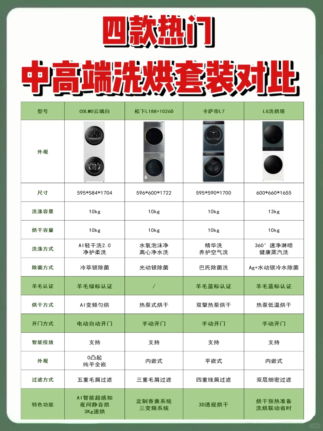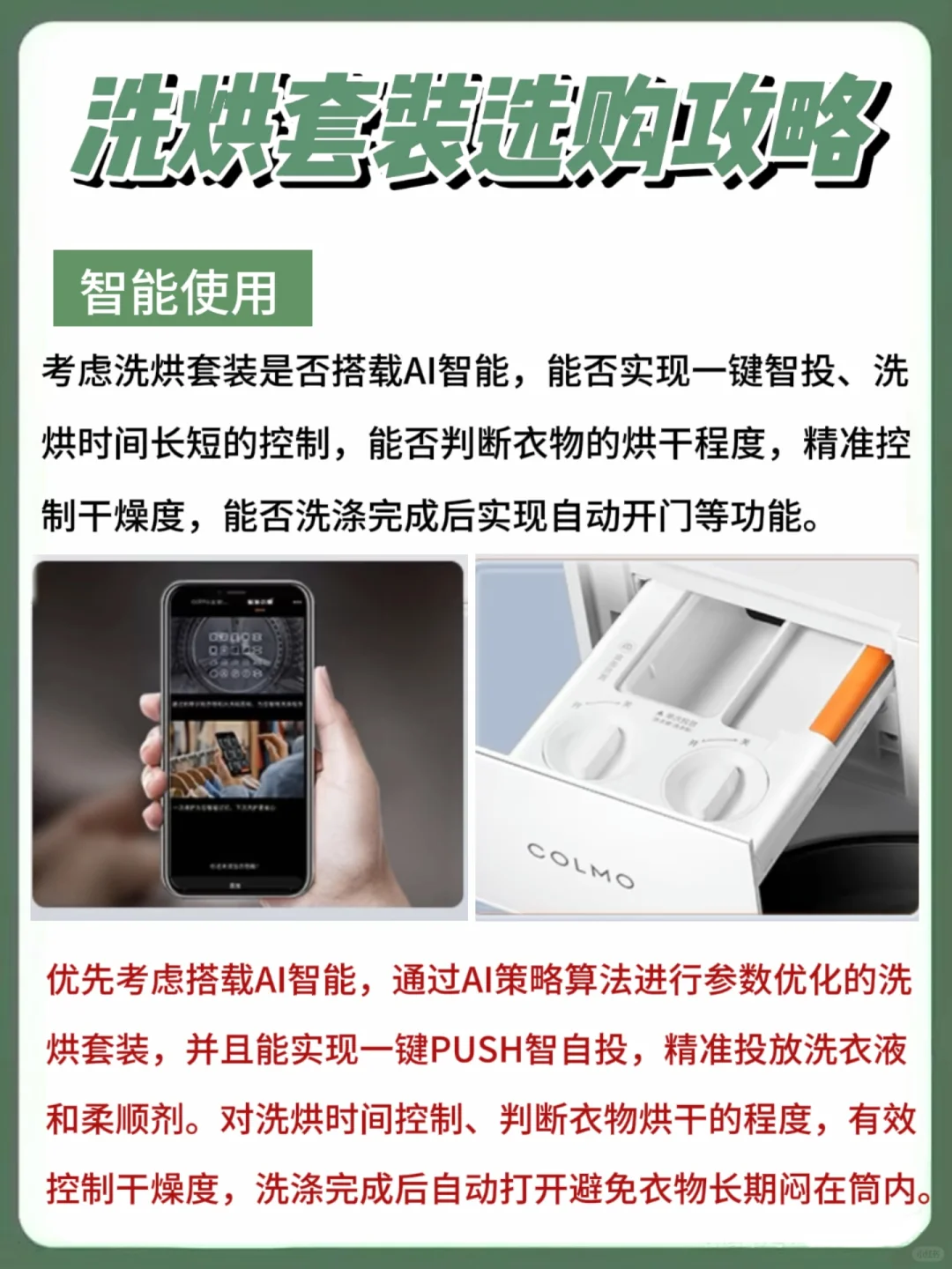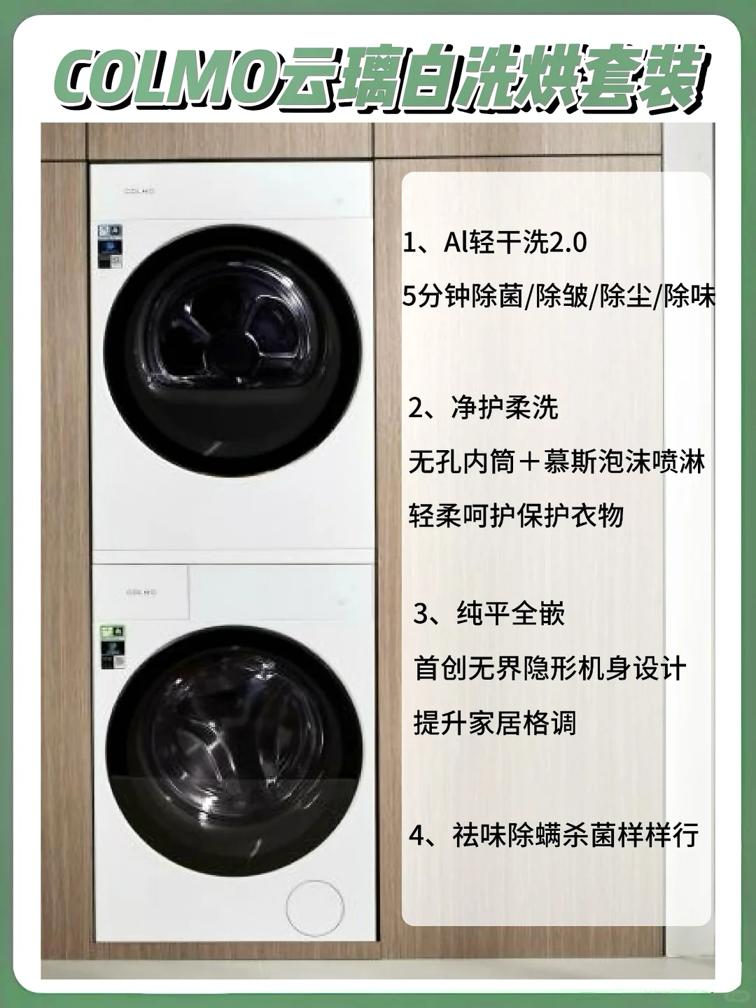 对比洗烘两大功能的特点,COLMO云璃白洗烘套装再合适不过了。其主打就是AI轻干洗和净护柔洗,高能软蒸汽深层穿透衣物纤维,在保护娇贵和特殊面料的情况下都能去除污渍,祛味除螨杀菌都是行内第一。还能5分钟快速干洗,实现居家干洗。还有智能AI感知和操控,体验感杠杠的。无界隐形机身设计也是深得颜控的喜爱啊,COLMO云璃白洗烘套装真的满满都是优点。