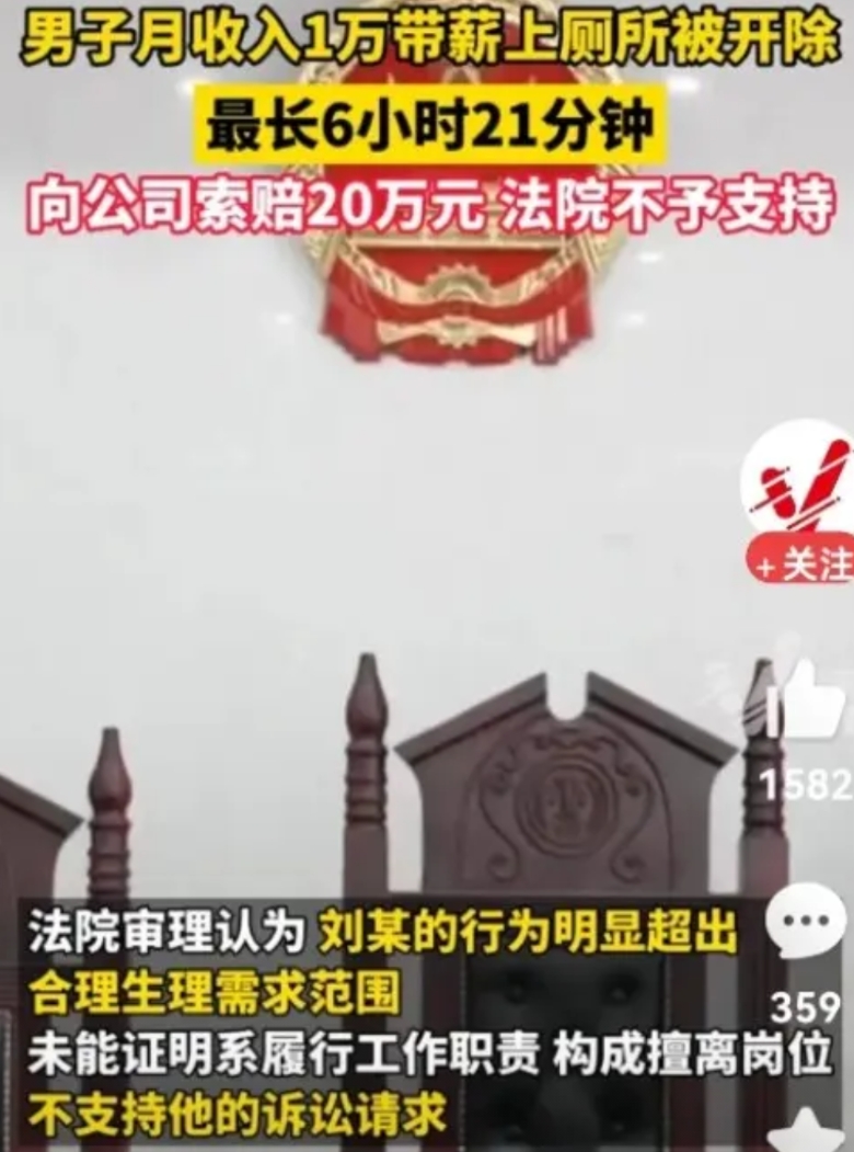 超出正常生理需求!江苏一男子找到一份月薪1万的工作,可老板却发现他经常去卫生间,有时一待就是6小时。之后,公司以“擅自离岗”将其解雇,男子不服将公司诉至法院,并要求其赔偿20万,法院判决亮了! 在江苏南通的一家电路公司里,一场看似平常的职场纠纷引发了全国范围内的热议。 2023年初春,公司人事部门接到多起匿名举报,称李浩(化名)频繁出入洗手间,且每次停留时间异常长。 起初,大家都以为李浩可能是身体出了问题,但随着时间推移,这种行为模式越发引人注目。 一个普通的工作日,李浩再次前往洗手间。这一次,他在里面停留了整整6个小时,从上午9点一直到下午3点。 同事们纷纷猜测,有人担心他是不是出什么事了,也有人怀疑他是不是在洗手间里睡觉。 当天下午,李浩若无其事地回到工位,面对同事们关切的询问,他只是含糊其辞地表示"没什么大事"。 在接下来的一周里,公司通过分析门禁记录和走廊监控,他们发现李浩几乎每天都会有2-3次长时间待在洗手间的情况,时间从最短31分钟到最长6小时不等。 8月的一天,公司决定采取行动。在一次例行的员工会议后,经理王新将李浩单独留下。 在办公室里,王新直截了当地问道:"李浩,你最近怎么回事?为什么总是长时间待在洗手间?" 面对直接的质问,李浩显得有些局促不安。他解释说:"最近消化不太好,所以......" 王新打断了他,拿出了一份详细的记录:"李浩,我们都很关心你。但是,公司调查发现,你在洗手间的行为并非因为身体原因。" 王新继续说道:"李浩,你在公司工作已经三年了。但是,你的这种行为已经严重影响了工作效率,公司决定解除与你的劳动合同。" 李浩一时难以接受,他辩解道:"可是公司没有明确规定员工上厕所的时间和次数啊!" 然而,公司的决定已经不可更改,李浩正式离职,但他并不甘心就此认输。 在接下来的一周里,他咨询了多位律师,最终决定向当地劳动仲裁委员会提起诉讼,要求公司支付20万元的赔偿金。 法庭上,李浩的律师极力为他辩护:"我的当事人李浩先生虽然在工作时间频繁如厕,但这属于正常的生理需求,因此不应以此为由解除劳动合同。" 公司的代表则出示了详细的证据,包括门禁记录、监控视频截图。这些证据清楚地显示,李浩在洗手间的大部分时间都在进行与工作无关的活动。 最终,法院作出了判决:驳回李浩的诉讼请求,支持了公司的解雇决定。 这个案件很快在网上引发了广泛讨论。有网友调侃道:"6小时?看来是他手机电量的上限啊!" 也有人认真分析:"这反映了当前职场中普遍存在的问题。很多人在工作时间处理私事,特别是玩手机,这确实会影响工作效率。" 这起事件也引发了人们对现代职场管理的思考。 如何在保障员工权益和提高工作效率之间找到平衡?如何应对移动互联网时代带来的新挑战?这些问题都需要企业管理者和员工共同探讨和解决。