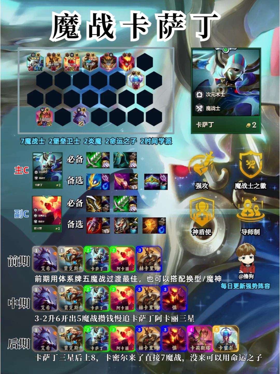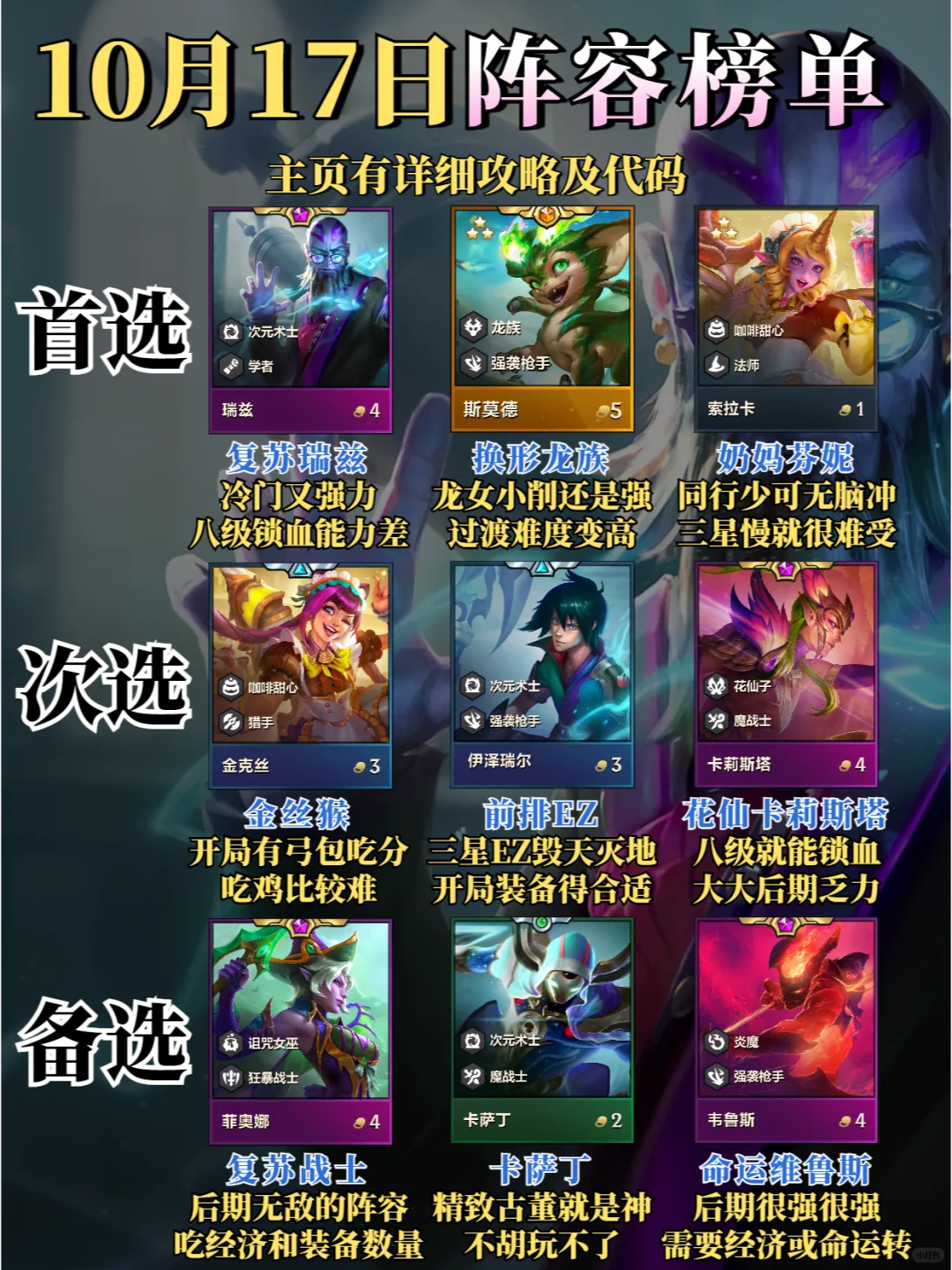 ❗阵容码进笔记下方粉丝群 首选:无脑可冲,但是要注意同行可能会比较多 次选:通常需要开局装备比较合适 备选:前置条件苛刻一些,但是成型后强度非常高