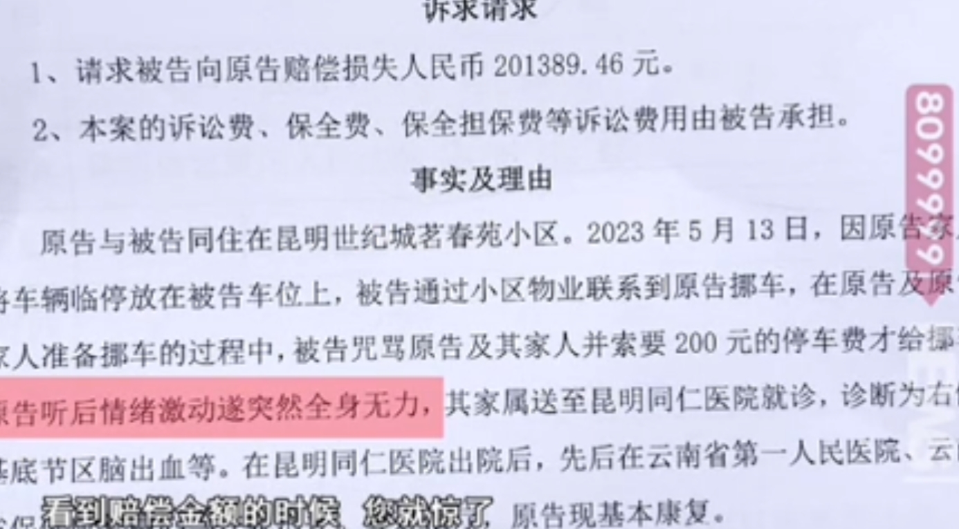 “讹天讹地讹空气!”云南昆明一女子回家发现自己小区车位被占,便打电话联系车主挪车。不料,车主直接带着一家老小,围攻辱骂女子。女子无奈报警求助,谁知,隔天车主狮子大开口,要求女子赔偿20万,说她气的自己父亲突发疾病住院。女子果断拒绝,车主一怒之下,将女子告上法庭,法院这样判了! (信息来源:昆明广播电视台2024.5.17——《自家购买的车位被霸占,车位主人叫对方来挪车,谁知一言不合起了争执》)